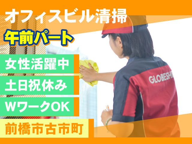 仕事内容 群馬県前橋市にあります 「グローブシップ株式会社 群馬営業所」 でのお仕事情報です。 今回の募集は、パートタイマー オフィスビルの清掃作業のお仕事です。 ━━━━━━━━━━━━━━━━ 勤務地/前橋市古市町 <ここがポイント> ・充実した福利厚生あり ・土日祝休み ・午前パート ・実働3.5時間/短時間 ・メリハリがある職場 ・キレイ好きに最適 ・ミドル、シニア世代も活躍中 ・女性活躍中 気軽にスタートできて、 お客様の役に立てて、 働いて得たスキルが 普段のお掃除にも活かせる! そんなメリットいっぱいの仕事です。 ━━━━━━━━━━━━━━━━ <仕事内容> パート/オフィスビルの清掃スタッフ 勤務地/前橋市古市町 具体的には、、、 ・床、階段、トレイなどが主な作業 ・ゴミ回収、掃除機掛けなど ※事務室、給湯室、屋外など 分担し1人作業で行ってもらいます ※一度覚えてしまえば年齢を問わず 長期で続けているスタッフ多数!! 勤務時間は、 「7:30~11:00」で実働3.5時間です。 午後はゆっくり自分の時間がるので、 時間を有効活用して働けますよ! <こんな方にオススメ> 「コツコツと作業に取り組むのが好き」 「適度に体を動かしてのびのびと働きたい」 という方にピッタリなお仕事です。 始めるにあたって特別な資格や経験は一切不問。 しっかりした研修制度で未経験でも安心です。 <ミドル・シニア世代活躍中> 定年退職して時間のある方、 早期退職された方、 空いている時間を有効活用したい方など ミドル・シニア世代にも最適!! <未経験者OK!> お仕事は丁寧に教えますので 清掃業務が未経験の方でも 安心してスタートできますよ。 わからないことがあれば 気軽に質問して頂いてOK! <主婦(夫)活躍中!> 子育て中の方も、 働きやすい時間帯でのお仕事です。 中高年の方も活躍している職場です! ご興味がございましたら、 まずはご応募ください。 お待ちしております!
