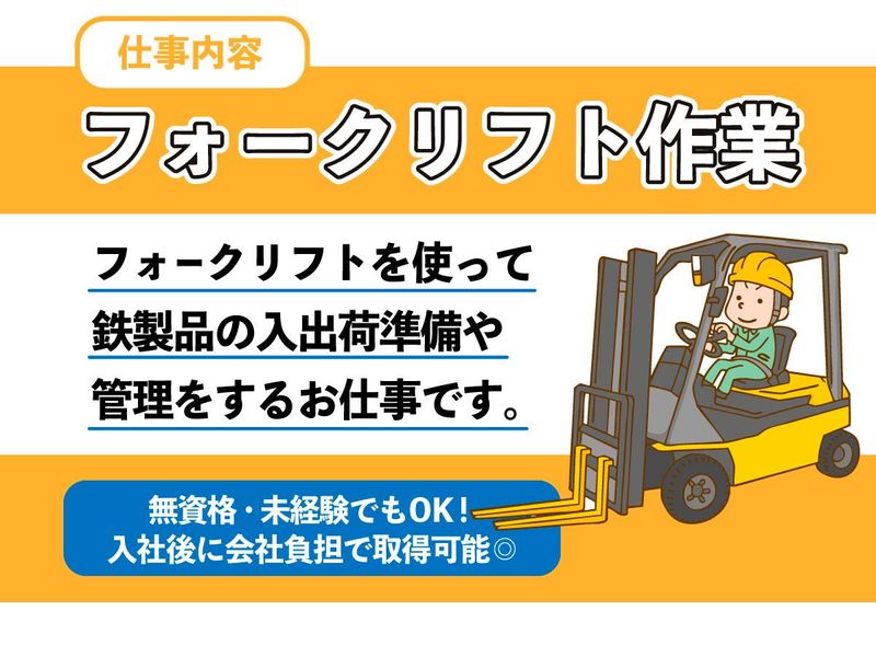 仕事内容 ★★★ 安心の資格取得支援制度あり! ★★★ 「フォークリフトの免許、持ってないんだよな…」 「経験も浅いし、ブランクもあるから不安…」 そんなあなたも、心配いりません! フォークリフトの資格を持っていなくても大丈夫。当社では、入社後に費用を全額会社負担で取得できます!仕事も、できる作業から少しずつお任せしていくので、まずはお気軽にご応募ください! ◎安定・安心の正社員雇用! ◎残業少なめ*あっても1日1時間程度! ◎うれしい入社祝い金あり! 残業が少ないので、プライベートの時間を大切にしながら、正社員として安定したキャリアを築くことが可能です◎ - 【仕事内容】 街でよく見かける門扉やフェンスといった鉄製品を、フォークリフトを使って入出荷・管理するお仕事です。難しい作業はなく、先輩スタッフがイチから丁寧に教えるので、安心してスタートできます! <1日の流れ(例)> ■午前 入荷した製品をフォークリフトで所定の場所へ運びます。 ■午後 出荷の準備や、トラックへの積み込み作業を行います。 現場の雰囲気を動画で確認可能! https://sinken-job.net/jobfind-pc/ ※伝票の読み書きや、日本語での安全講習・朝礼があるため、日本語での円滑なコミュニケーション(読み書き・会話)が必須となります。
