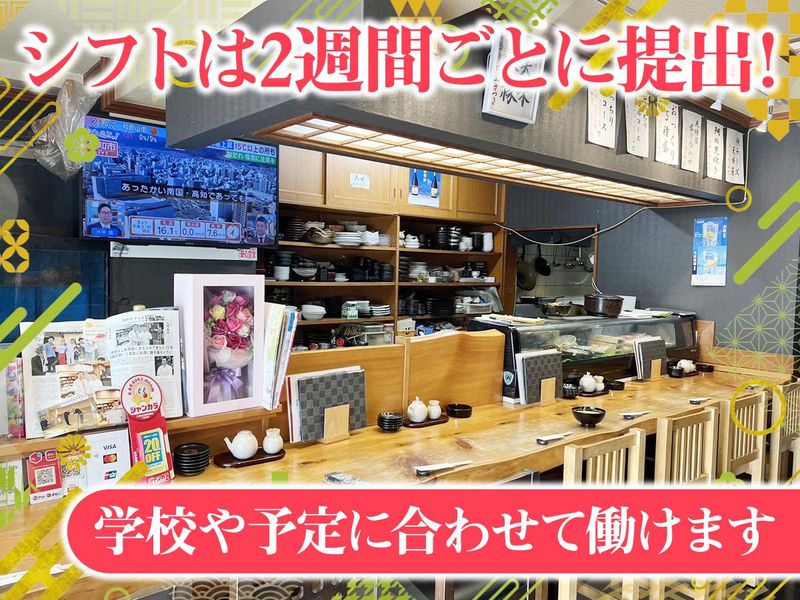 仕事内容 \✨お客さんに愛される!地元で人気のお寿司屋✨/ ✅お寿司などのまかないあり!持ち帰りもOK! ✅髪色自由!金髪などブリーチした髪でも◎ ✅新生活に合わせてシフトの相談もお気軽に! ✅個人店なのでマニュアルに縛られず自由に働ける! ✅給与手渡しで稼いだ分がすぐに手に入る! 【具体的には】 ・お客様のご案内 ・オーダー取り ・料理、ドリンクの提供 ・洗い物 ・ドリンク作り などホールのお仕事 まずは笑顔で挨拶&丁寧な対応ができればOK! こぢんまりとしたお店なので、 ばたばたして接客ができないなんて こともありません! お客様も落ち着いた方が多いので、 ゆったりとした空間でお仕事できます◎ 「この料理の名前なんだっけ…?」 「どの順番でもっていけばいいの…?」 「テーブルセッティングのやり方は…?」 など、分からないことがあればなんでも聞いてください◎ 3年以上続いているスタッフもいて、 長く続けられるほど居心地がいい環境です! 忘年会など、みんなでパーッと 打ち上げにいくこともあります♪ \ここがポイント/ ・飲食バイトが初めての方も安心 ・紙に書いてオーダーをとる形式 ・調理はほぼなし ・魚の種類は最初はわからなくて大丈夫 ・働いているうちに覚えていけます ・基本的に店長と2人体制 ・わからないことがあれば何でも聞いてください! ・学業や家庭との両立もバッチリ \すなみについて/ JR「立花駅」北口から徒歩2分! テーブル3卓とカウンター7席の見渡しやすい店内です♪ 「回らないお寿司屋さん」というと 堅いイメージがあるかもしれませんが、 『すなみ』のお客様は常連の方がほとんど♪ スタッフも学生が多いので、 和気あいあいとした雰囲気です。 お店のことがちょっとでも気になったひとは 是非ご応募いただき、 面接のときに雰囲気を感じてみてください! \店長よりコメント/ はじめまして!すなみの店長です。 大学生やフリーターさんなど、 うちでは色んな子が働いてきたので それぞれに合わせた働き方をしてもらえると思います。 アルバイトが初めての方も、 うちでなら徐々に慣れていける環境なので 安心してご応募ください。お待ちしています♪ \スタッフよりコメント/ 「扉を開けるまではドキドキしましたが、 気さくで優しい店長と先輩が迎え入れて 下さったので安心できました。 学生では中々気軽にこれないお店なので… ちょっと得した気分になります(笑)」 \プライベートとの両立はバッチリ/ シフトは2週間に1回、 SNSで店長にシフトを提出していただきます。 「テスト前だからこの日はお休みしたい!」 「サークル終わりのこの時間から働きたい」など、 それぞれに合わせてシフトを組むことが可能! \嬉しいまかないあり/ お仕事を頑張った後には…まかないで体力回復! お寿司、親子丼、などなど、 店長がおまかせで作ってくれます♪ 持って帰ってもOK! 一人暮らしの学生さんからは大好評です! 自炊が苦手な方や、食費を節約したい方にもおすすめ◎