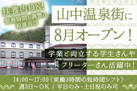 仕事内容 ★2025年8月初旬にオープンしたばかりの新ホテル★ 魅力的にリブランドした 「山中温泉 河鹿荘」を訪れるお客様を、 笑顔でお迎えするフロント業務です♪ << 業務詳細 >> □:チェックイン業務 □:予約管理を含む電話応対 □:予約問い合わせメールの返信対応 □:キャッシャー等の金額確認 (中間チェック、ダブルチェック) その他、状況に応じて アメニティ補充や、大浴場等の付帯設備の 簡単なチェック作業などもお願いします! << 入社後の流れ >> ▼オリエンテーション (施設内案内、会社概要、 ハウスルール、主な業務の説明、質疑) ▼ホテル館内施設の内覧説明 ▼ホテルで使う簡単な用語説明 ▼基本的な接遇レクチャー ▼ホテルシステムの研修 (慣れてきた段階でデモトレーニング開始) 丁寧なサポートのもと、 できることから段階を踏んで お任せしていきますのでご安心ください。 未経験の方でも、1ヶ月から3ヶ月ほどで ひと通りの業務を習得できます。 接客やホテル業務が初めての方でも、 安心してスタートできますよ◎ 「山中温泉 河鹿荘」について 勤務地となる「山中温泉 河鹿荘」は、 加賀市の山中温泉街に位置し、 まろやかな泉質の天然温泉と、 鶴仙渓を望む渓谷美に恵まれたロケーション。 四季折々の自然と歴史ある 温泉街の魅力に囲まれた環境で、 お客様に癒しの時間を届けるとともに、 スタッフ自身も心地よく働ける職場です。 日々の業務のなかで、 自然のやすらぎや地域の温かさを感じられます。 館内には、四季の自然を感じられる露天風呂や、 大聖寺川を望むラウンジ、 地元食材を使った料理を提供する レストランなどがあり、 訪れるお客様に“癒しと感動”をお届けしています。 【週3日~OK】午後からの空き時間で無理なく働きやすい♪ ◆14:00~17:00(実働3時間) ◆勤務時間の調整は相談可 ◆週3日~勤務OK ◆残業ほぼなし/原則定時退社 「学校が休みの曜日にシフトに入りたい」 「扶養内でシフトが組みたい」 「土日祝メインで働きたい」など 午後の空いた時間を有効に活用できます。 都合に合わせて希望休も提出できるので プライベートと両立しやすい環境です◎ \ 学生スタッフも活躍しています / 未経験スタートでも、働きながら 接客スキルや経験を積んでいける環境です。 ホテルでの仕事を通して、 美しい所作やマナーが学べますし、 コミュニケーション力も身に付けられるので 就活や将来の社会人生活でも役立ちますよ! < 企業情報 > 株式会社ジャパンリゾートホテルオペレーションズは、 東京を拠点に国内各地に特色豊かな 複数ブランドのホテルを運営する ソラーレ ホテルズ アンド リゾーツ株式会社のグループ企業です。 ソラーレ ホテルズ アンド リゾーツグループのホテルは、 どのホテルもアクセス抜群のロケーション、 上質なおもてなしに重点を置き、 お客様により便利で快適な 環境と時間をご提供しています。