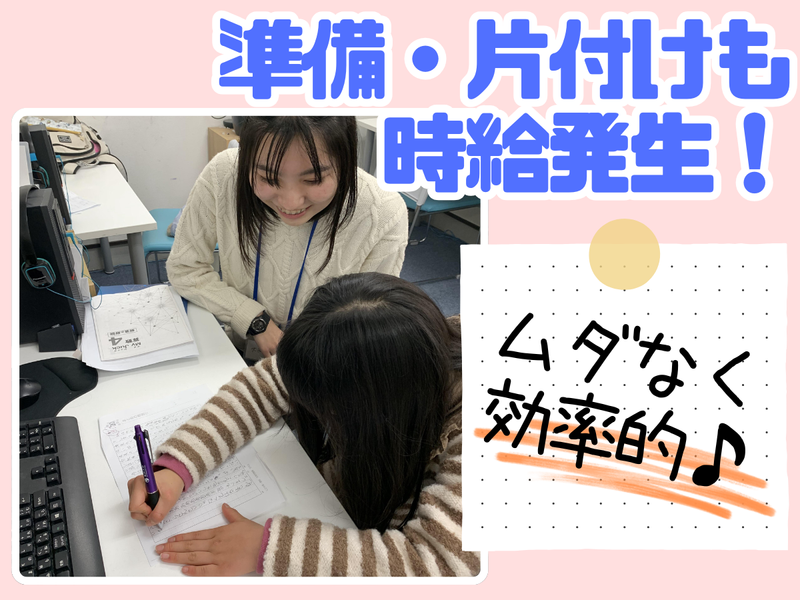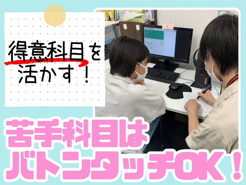 仕事内容 \塾の先生 未経験の方も大歓迎✨/ ✅高時給1350円〜! ✅準備時間も時給が発生◎ ✅テスト・帰省休みも考慮! ✅週1日・3時間〜OK♪ ✅私服でOK!スーツ着用不要! 【仕事内容】 小・中学生を対象とした個別学習塾のチューター業務です。 難しい講義ではなく、生徒の「わからない」に隣に寄り添い、ヒントを出してあげるなどのサポートが中心です! ▼問題の質問対応やヒント出し ▼丸つけや進捗度のチェック、簡単な声掛け ▼定期テストや中学・高校受験に向けた目標サポート ▼ICT教材を使っての学習の補助 ▼生徒の入室・退室時の明るい挨拶と見送り 【ここがポイント⭐】 ◇「1対1」のプレッシャーはありません! ――――――――――――――――――― 生徒1人をマンツーマンで担当するのではなく、数名の生徒に対して、先生もチーム体制でサポートします! 生徒が「ここ教えて!」となった時に対応するスタイルなので、ずっと講義をし続ける必要はありません。 ◇苦手科目は他の先生にバトンタッチOK! ――――――――――――――――――― 「英語は得意だけど、数学はちょっと…」という方もご安心を♪もし答えられない質問が来ても、近くにいる他の先生に「ここお願い!」とバトンタッチしてOK! その場でチーム解決できるので、あなたの得意な分野を活かせれば大丈夫です◎ ◇準備や片付けの時間も時給が発生! ――――――――――――――――― 塾バイトによくある「授業前後が無給になるコマ給」ではありません! 入室から退室までの滞在時間すべてに時給が発生するので、無駄なく効率的に稼げます♪ 【先輩スタッフから見た塾長先生】 塾長先生は、元・高校の英語の先生でまさに教え方のプロです! 『一人ひとりをしっかり見たい』という熱い想いで塾を開いた方なのですが、とにかく温厚でいつもニコニコしています。 生徒が少しでも成長すると自分のことのように喜ぶ姿は、見ていてこちらも嬉しくなります。 私たち講師のこともすごく大切に考えてくれていて、テスト期間や帰省など、学生ならではの都合も『優先していいよ』と快く調整してくれます。 教え方で迷っても元教員の視点で優しくコツを教えてくれるので、塾バイトが初めてだった私も安心してスタートできました!