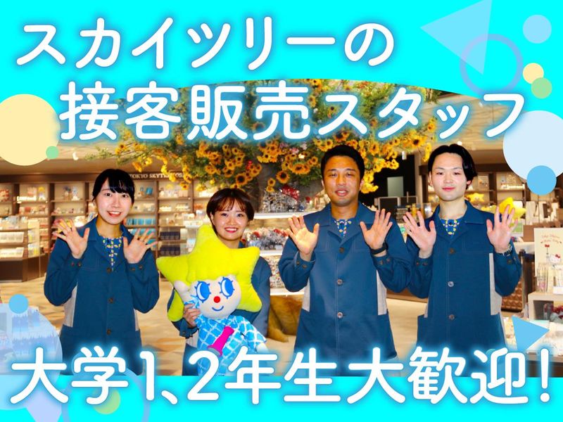仕事内容 \東京スカイツリーでのお仕事/ =============== ✨海外からも注目される 人気観光スポットでアルバイト! ✨半年に1度の評価制度により 昇給の可能性有! ✨週3日以上勤務できる方、大歓迎!! 大学1.2年生活躍中!! ✨一つの職場で 長く腰を据えて働きたい方歓迎 ✨就活にも活かせるスカイツリーの仕事 ✨高校生可!4月からの新生活に向けて、 今からしっかり稼げます♪ =============== \安定して働ける“メインバイト”を探している方に/ 東京スカイツリーの公式ショップで、 長期・継続勤務を前提に成長できる環境です。 <具体的な仕事内容> スカイツリー内の オフィシャルショップにて ・接客 ・レジ ・商品陳列 ・お客様対応などをお任せします! ========== ⭐メリット多数⭐ ========== ✅こんな方にピッタリ ・語学経験を活かしたい方 ・接客のお仕事がしたい方 ・人気の観光地でお仕事がしたい方 ・アミューズメント施設やテーマパークでの 勤務経験、 アパレル、雑貨などの販売経験、 カフェ、レストラン、飲食店での 接客経験も活かせます! ✅半年ごとの評価制度あり! 勤務姿勢・スキル次第で、 時給UPのチャンスあり! 長く続けていただくことで チーフ・リーダーも目指せます! ここでの経験は就活にも活かせます! ✅福利厚生充実♪ ・嬉しい従業員割引有! 東京ソラマチの一部店舗にて従業員割引有 ・インフルエンザ予防接種補助金あり ・年末年始手当あり ・アーリー・レイト手当あり (早朝出勤・22時以降退勤で1勤務+300円支給) ✅海外からの需要も高いスカイツリー アルバイトを通して接客・語学スキルも身につきます! 就活に活かしたい学生さんにはピッタリ! 英語が活かせるオシゴト♪ ✅シフトの調整可能 ・平日開店からの勤務や平日夕方以降も相談可 「授業終わりで週3日の夕方から」や 「比較的時間があるのでアルバイトをたくさんしたい」等 色々な働き方が実現できます! 学校や趣味との両立可能! ぜひご希望をご相談ください! <働き方のイメージ> <大学1年生A君> 9:00~ 1限授業 10:40~ 2限授業 12:10~ ランチ 13:10~ 3限授業 14:50~ 課題 17:30~ スカイツリーでアルバイト 22:30~ 退勤!お疲れ様でした! ✅研修制度充実! <入社後の流れ> ▼初回研修:ルールや接客の基礎を学びます ▼2回目以降:売場研修が始まり 商品陳列やレジ業務を覚えます その方の覚えるスピードに合わせ お教えしますのでご安心ください! ✅一緒に働く人はこんな方々! 20・30代を中心に20~40代まで活躍中! アルバイトの人数は全体で100人! 男女比は4:6 スタッフ同士、ランチをしたり 遊びに行ったりとても仲が良いですよ!