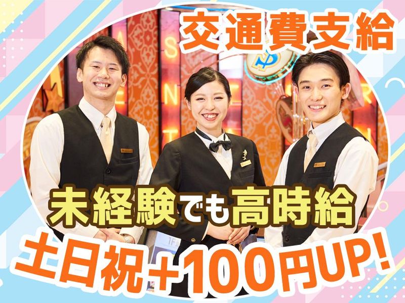 仕事内容 【新着】アルバイト・パート積極採用中! パチンコ店でのご案内スタッフ \今だけ!お友達紹介キャンペーン/ アナタとお友達それぞれに2万円ずつ支給! (規定あり) 《お仕事詳細》 ・店内のご案内、遊技台の簡単な説明 ・フロアの清掃や備品のチェック ================== ✩未経験でも安心!MAX時給1750円! ✩週1日~&1日3h~OK!シフト柔軟対応! ✩長期勤務歓迎!(3ヶ月以上働ける方) ✩重たい作業ナシ!女性スタッフ活躍中! ================== *ほとんどのスタッフが未経験スタート! 挨拶・マナーなど、 研修でイチから丁寧に学べるので安心! *楽々システム導入で玉運びなし! 重たいドル箱運びなどの力仕事ほぼなし 初心者さんでも安心して始められます! *原則屋内禁煙! 客席と独立してお客様専用喫煙室あり。 タバコの臭いや煙も気になりません!