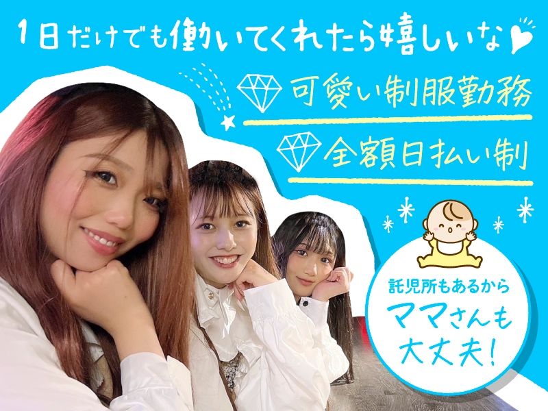 経験・資格 ◇未経験者さん大歓迎 ◇経験者さん優遇 ◇学生さん、Wワークさん、フリーターさん大歓迎 ◇お酒が飲めなくてもOK ◇お友達同士の応募も歓迎 ◇履歴書不要 経験や学歴は一切関係なし! 自分の好きな事や好きなもの、趣味や特技など 自分が持っているものや大事なものがあれば大丈夫! 実際『趣味はありません!』って子も楽しく働いているので ありのままの自分を表現できればALL OKです♪
