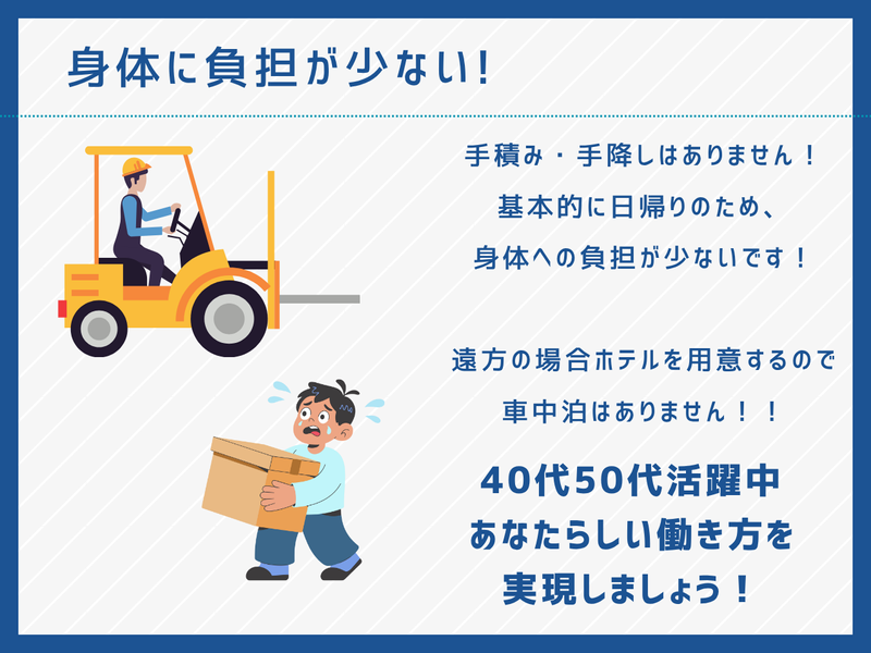 大型免許所有者歓迎!資格取得支援あり!日帰り/17時には帰宅
