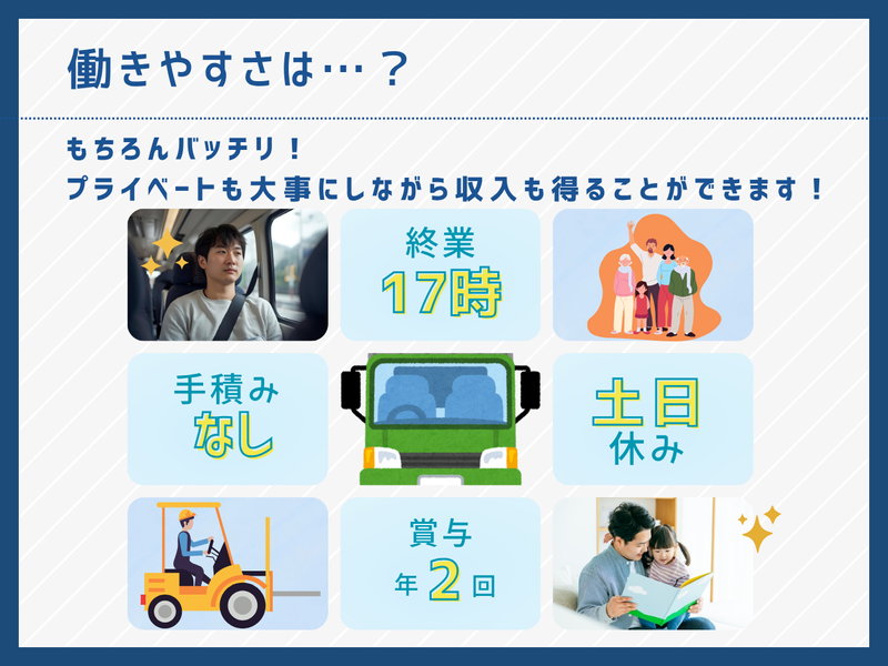仕事内容 \\✨この求人のアピールポイント✨//  ̄ ̄V ̄ ̄ ̄ ̄ ̄ ̄ ̄ ̄ ̄ ̄ ̄ ̄ ̄ ̄ ̄ ̄ ̄ ✅日帰り中心で毎日家に帰れる! プライベートも充実 ✅完全週休2日制(土日休み)で しっかりリフレッシュ ✅月給25万円以上! 頑張り次第で月収35万円も可能 ✅社会貢献度の高いリサイクル事業で やりがい◎ ⭐会社について⭐  ̄ ̄V ̄ ̄ ̄ ̄ ̄ ̄ ̄ ̄ ̄ ̄ ̄ ̄ ̄ ̄ ̄ ̄ ̄ 食品リサイクルを通じて、 持続可能な社会の実現に貢献する会社です。 食品工場から出る食品製造副産物を、 栄養価の高い飼料へと 生まれ変わらせています。 この取り組みは各種メディアからも 注目を集めており、 安定して成長を続けています。 「もったいない」を価値に変え、 食品ロス削減と畜産業の発展を支える、 社会貢献度の高い事業です。 ⭐仕事内容⭐  ̄ ̄V ̄ ̄ ̄ ̄ ̄ ̄ ̄ ̄ ̄ ̄ ̄ ̄ ̄ ̄ ̄ ̄ ̄ ●8t 13tのウイング車、平車または 13tタンクローリーを運転いただき、 リサイクル飼料を畜産農家へ届ける ドライバーのお仕事です。 愛知県・岐阜県・静岡県を中心とした 近距離・中距離配送がメイン。 安全運転で、 大切な飼料を待っているお客様のもとへ 届けることがミッションです。 ⭐具体的なお仕事⭐  ̄ ̄V ̄ ̄ ̄ ̄ ̄ ̄ ̄ ̄ ̄ ̄ ̄ ̄ ̄ ̄ ̄ ̄ ̄ ⏩業務範囲・対象 └ 担当エリア(愛知・岐阜・静岡が中心)の 畜産農家様へ、 タンクローリーで飼料の原料を 配送します。 <配送業務> ・出社後、その日に乗る タンクローリーの点検 ・食品工場で飼料の原料を タンクローリーへ積み込み ・決められたルートで畜産農家様を訪問し、 飼料を納品 ★働き方のポイント 朝は6時頃からと少し早いですが、 その分17時には退社できる日も多く、 夕方の時間を有意義に使えます。 <その他> ・配送終了後の業務報告 ・車両の清掃など ★車両について 13tのタンクローリー、 8t13tのウイング車と平車を使用します。 週代わりで車両をチェンジしながら、 近距離・中距離のルートを ローテーションで担当します。 ⏩進め方・スケジュール └ 配送は基本的に日帰りです。 まれに長距離配送をお願いする場合も ありますが、 その際は会社がビジネスホテルを 用意するのでご安心ください。 車中泊は原則ありませんので、 身体の負担が少なく働けます。 ⭐キャリアアップ&教育制度について⭐  ̄ ̄V ̄ ̄ ̄ ̄ ̄ ̄ ̄ ̄ ̄ ̄ ̄ ̄ ̄ ̄ ̄ ̄ ̄ ドライバーとして経験を積んだ後、 将来的には運行管理などへの ステップアップも目指せます。 業務に必要なフォークリフト免許は、 入社後に会社負担で取得可能です。 大型免許は必須ですが、 タンクローリーの運転が初めての方でも 大丈夫。 最初は8t車など、 運転しやすい車両からお任せするので ご安心ください。 ⭐職場の雰囲気⭐  ̄ ̄V ̄ ̄ ̄ ̄ ̄ ̄ ̄ ̄ ̄ ̄ ̄ ̄ ̄ ̄ ̄ ̄ ̄ 23名のスタッフが在籍しており、 うち5名が女性です。 50代からドライバーとしてスタートした 社員も活躍中です。 「がっつり稼ぐより、 ある程度安定した収入で プライベートも大切にしたい」 そんな方にピッタリの環境です。 女性ドライバーも働きやすい職場ですので、 ぜひお気軽にご応募ください。