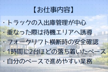 仕事内容 飲料工場の入口でトラックの入出庫を管理する仕事です。 トラックが重なった際は待機エリアへの誘導を行い、フォークリフトが道を横断する際には安全に渡れるよう周囲の確認をお願いします。 トラックの出入りは1時間に2台ほどと落ち着いたペースですが、繁忙期には適度に動きがあり、メリハリを持って働ける環境です。 来る際には事前に声掛けがあるため、不意な対応はありません。 業務の流れはシンプルで覚えやすく、長期で安定して働きたい方にも続けやすい内容です。 【働きやすい日勤シフト】 日勤のみの勤務で、生活リズムを整えながら安定して働ける環境です。 出荷状況により早く終わる日もありますが、日給はしっかり保証されます。 平均して16時台に終わる日が多く、家庭やプライベートとの両立もしやすいのが特徴です。 夜勤がないため負担が少なく、長期で無理なく続けられる働き方です。 【落ち着いたペースで進められる環境】 トラックの出入りは1時間に2台ほどと落ち着いたペースですが、繁忙期には適度に動きがあり、メリハリを持って働けます。 トラックが来る際には事前に声掛けがあるため、不意に対応が必要になることもなく、流れをつかみやすい環境です。 繁忙期は台数が増えますが、業務自体はシンプルで、慣れれば安定して進められます。 【相談しやすいフォロー体制】 現場は1名体制ですが、困った時や判断に迷う場面ではすぐに連絡でき、担当者が状況を確認して対応します。 研修もしっかり行うため、初めての方でも業務の流れを安心して覚えられます。 長期で働きたい方にも、安定して続けられるフォロー体制が整っています。 適度な距離感で働きやすい雰囲気のため、長期で安定して続けられる職場です。 【通いやすく、休憩しやすい環境】 京王多摩川駅から徒歩10分と通いやすい立地です。 近くにコンビニがあり、休憩もしやすい環境が整っています。 無理なく続けられるだけでなく、安定して勤務日数を確保しやすい働きやすい現場です。