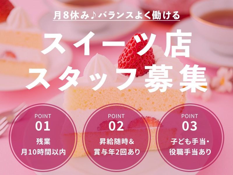 仕事内容 ~・~・~・~・~・~・~・~ \お菓子好き集合/ ✅契約更新回数上限なし 有名チェーンスイーツ店スタッフ募集 ~・~・~・~・~・~・~・~ ✨魅力POINT ●随時昇給! ●未経験OK!マネジメントを学べる ●月8日休み&残業少なめ ●30~50代活躍中の落ち着いた店 ●盛り付けや包装などやりがいあり < 仕事内容 > 人気スイーツチェーン 「シャトレーゼ」のFC店舗で 店舗運営業務をおまかせします。 ・接客や販売、商品陳列、ギフト包装 ・商品発注、商品在庫管理 ・簡単なケーキの盛り付け ・スタッフ管理、人材育成 ・売上管理 ・開店、閉店業務