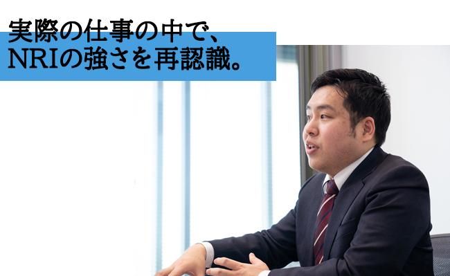 仕事内容 以下の分野に関する業務をお任せする予定です。 <システム化構想> デジタル・ITを活用した企業の事業変革・業務変革・事業創造を実現するための業務・システム化構想からシステム化計画の策定を支援します。 企業が安心してシステム設計工程に進め、導入効果を得られるよう、体制、期間、費用、リスク等を想定し、新業務や新システム要件を明文化することを範囲とします。 従って、企業の情報システム部門のみではなく、経営部門、ユーザー部門も交え、業務改革・システム化推進体制の提言から、業務要件定義やシステム機能定義といった設計を含めた活動までを実施しています。 ■業務内容一例 ・顧客の業界・ビジネスを理解した上での、デジタルを用いた新たなビジネスモデル・収益モデルの構築、PoC(実証実験)支援 ・業務・システム構築構想・計画の策定支援 ・既存システムの可視化・評価(品質・コスト・活用状況) <プロジェクトマネジメント> 大規模システム構築・導入プロジェクトにおいて、ユーザー企業の立場で、業務改革・定着の支援や、システム構築・導入プロジェクトの推進・管理を支援します。 NRIはユーザー企業の情報システム部門を出自とする特徴を活かし、特定のハードウェア製品やソフトウェア製品に拘束されない中立的・客観的な観点で、多くのベンダーやメーカーが関わる大規模システム構築・導入プロジェクトの確実な完遂を支援する活動を実施しています。 ■業務内容一例 ・プロジェクトマネジメント、複数プロジェクトの統合的マネジメントの実行支援 ・仮説構築~PoC(実証実験)~本格展開支援 ・システム調達支援・RFPの策定支援 <ITマネジメント> ヒト、モノ、カネ、リスク、データといった多角的な観点から、各種DX・IT戦略の策定、企業のデジタル変革や、デジタル・情報システム部門運営の支援をしています。 ■業務内容一例 ・情報戦略/IT戦略/デジタル戦略の策定・実行支援 ・DX推進/IT運営機能・組織(情報子会社を含む)の変革支援 ・デジタル人材戦略立案・育成計画・実行支援 ・デジタル/IT投資・コスト管理手法の構築支援 ・統合リスクマネジメント体制の構築支援 ■■■キャリア入社で活躍する社員インタビュー■■■ トヨタ支店/シニアシステムコンサルタント/平松 秀基 学生時代は日本の食料問題に興味を持っていました。研究を進めていく中でデータ収集や分析の非効率さを改善するための手段としてITに着目。就職活動ではITで社会問題やビジネス課題を解決する企業として、外資系コンサルティング会社を志望し、入社。エンジニアとして2年間開発を担当した後、上流工程の企画・コンサルティングに2年間携わりました。 □□これまでの経験を活かし、もっと顧客志向で。□□ システム開発やコンサルティングをある程度経験し、自分の“次のキャリア”を考えていたタイミングで出会い、興味を惹かれたのがリクナビNEXTに掲載されていたNRIの求人情報です。以前一緒に仕事をしたこともあり、NRIの「顧客志向の強さ」は自分にとっても非常に印象深いものでした。加えて、名古屋での募集であったこと。私は愛知県出身で、社会人になった頃から「近い将来、愛知県で働きたい」という希望を持っていました。これまでのキャリアを活かし、もっと顧客志向で。そして自分の働きたい地域で働くことができる。この2つがNRIへの転職を決めた理由です。 □□実際の仕事の中で、NRIの強さを再認識。□□ NRIへの入社は2020年2月。すぐにアサインされたのは、グローバルなトップクラス企業のDX案件です。ここで自分が提案したのはノーコード・ローコードツールによるPoCのスピードアップや効率化。お客様との情報連携・共有に役立ち、「これがあったから進めることが出来た」と言っていただけました。仕事の進め方という意味では前職とそれほど変わりませんが、違いはお客様との継続的な関係性だと思います。自分が新しいことを提案し、そこから建設的な話し合いをして実際に実現出来たのも、すでに先輩コンサルタントに対しての厚い信頼があったから。関係性の良さは仕事の進み具合につながりますし、私が感じたNRIの顧客志向の強さを仕事の中で改めて認識しています。 □□世界を相手にした最先端プロジェクトに携わりながら、学ぶ機会も多い。□□ 名古屋で進んでいるプロジェクトは最先端領域の案件が多く、日本全体、そしてグローバルに影響を与えるような内容も少なくありません。顧客先社員も優秀な方ばかりなので学ぶ機会も多く、自分の新しい成長につながっています。私の視点では、外資系企業は仕組み化やナレッジマネジメントが強く、NRIは人への教育・投資により注力していると感じます。特にシステムコンサルタントは、一人一人が自分で新しいことを考え、PoCを繰り返しながら自分で実装していくようなイメージで、周囲のサポートや連携もしっかりしていますね。仕事のスピード感や、声を上げればやりたいこ