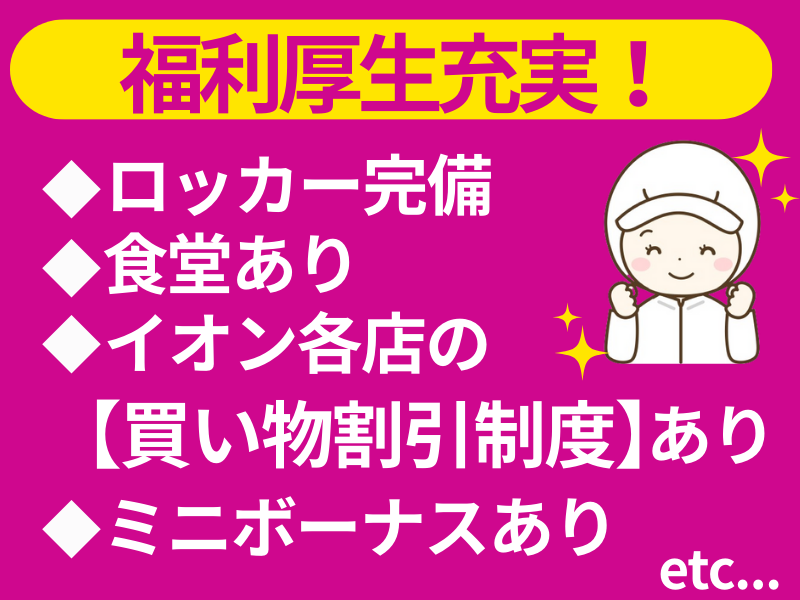 職場環境 当社はイオングループの プロセスセンターとして 水産・畜産・農産の生鮮3品と 生鮮デリカの製造・加工を行い イオングループ各店に 商品供給をしています。 中国・アセアンにも展開していくことで アジアNO.1のプロセスセンターに なることを目指しています。 喫煙所:なし(敷地内全て禁煙)