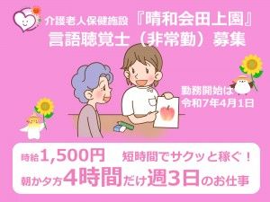 仕事内容 介護老人保健施設「晴和会田上町」における 言語聴覚療法業務をお願いします。 ・週12時間、週2~3日(木・および他平日) のお仕事です。 ・勤務開始日は令和7年4月1日です 【従事業務の変更の範囲】 なし 【就業場所の変更の範囲】 なし