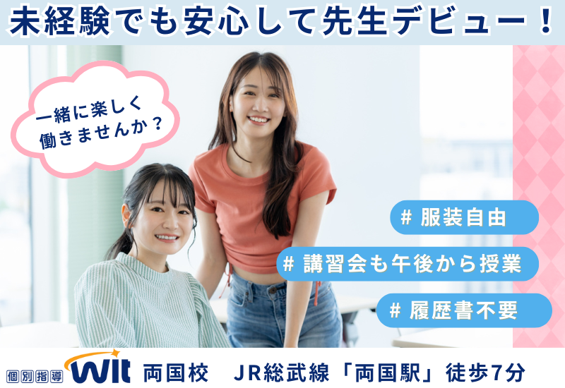 仕事内容 \ 大学生講師、募集中✨ / 大学帰りに、そのまま教えるお仕事にチャレンジしませんか? 【お仕事内容】 ■ 個別指導Wit 両国校の講師(小〜高校生対象) 生徒一人ひとりに寄り添う、完全個別スタイルの授業です。 1コマ90分(授業80分+準備・報告10分)。 小学生は国語・算数、中学生は英語・数学が中心で、得意な教科を活かして担当できます♪ 【未経験でも安心】 研修があるので「教えるのは初めて…」という方も大歓迎! 教室長や先輩講師が丁寧にサポートします。 【Witで働く魅力】 ◎ 私服勤務OK!学校帰りにそのまま勤務可能 ◎ 生徒と一緒に成長できる、やりがいのあるお仕事 ◎ 新しい塾だから、雰囲気づくりにも意見が反映されます 「将来の就活に役立てたい」 「人前で話す力をつけたい」 そんな理由でも大丈夫! Witで、あなたの“やってみたい”を形にしませんか?✨