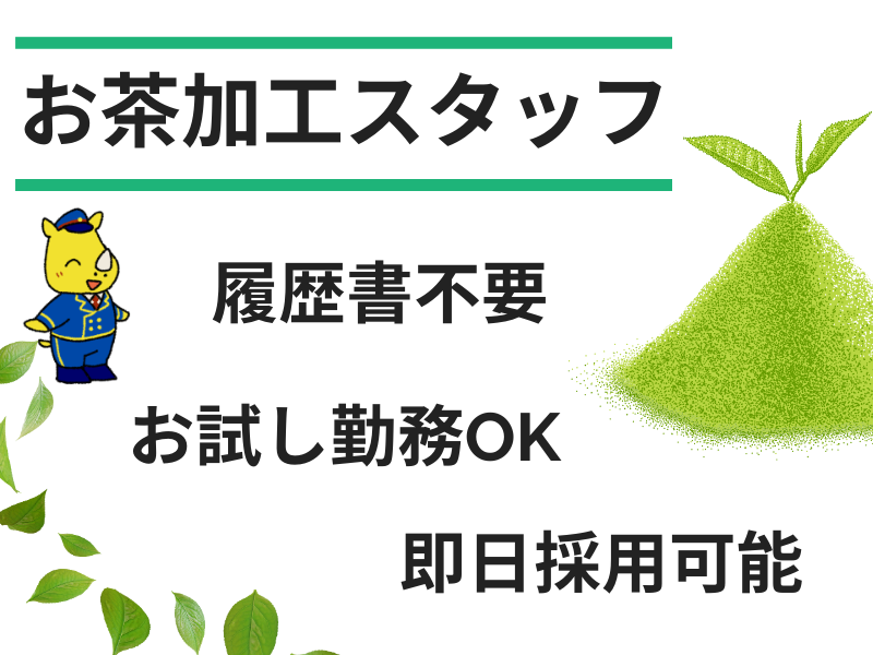 仕事内容 重量物ナシ◎ 女性も活躍できます◎ ▼工場内軽作業 ・仕分 ・配合 ・加工(火を入れる・焙じる) など ★最初は簡単なお仕事から★彡 未経験の方や不安な方には 自信がつくまで丁寧にしっかりとお教えします。 お茶の目利きができる社員の指示を受けながら、 さまざまな茶葉を機械に入れてブレンドし、その後、加工します。 運搬・積込・仕分・配合・加工等の業務を スタッフみんなで力を合わせて行っています。 お茶の魅力を知っていただき、 ともに体を動かし製造に携わってもらえる方を募集しています。 \未経験者歓迎/ 現在活躍しているスタッフの中にも、 お茶業界で働いたことがない方や、 まったく違う職種の仕事をしていた方も たくさんいらっしゃいます。 \フリーター歓迎/ ほかのお仕事とのかけもちOK◎ 希望勤務日数などのご希望をお伺いいたします。