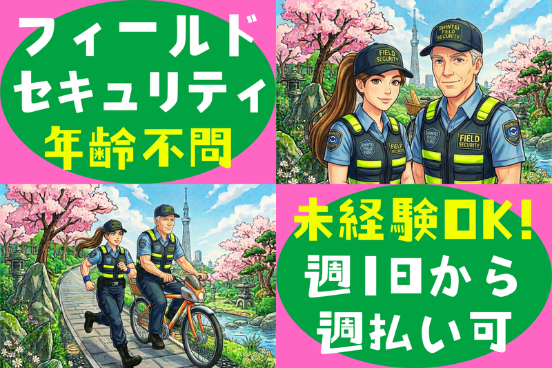 仕事内容 *オープニングスタッフ!都立公園フィールドセキュリティ* 都内にある広々とした都立公園を巡回し、利用者の安全を見守るお仕事です。 巡回は、徒歩や自転車での移動となります。 4月から開始のオープニングスタッフを大募集!! 毎日稼働しているので勤務日程は思いのまま! 週1日からでもエントリーOKです。 ライフスタイルに合わせてお仕事ができます。 ✅選べるシフトで働きやすい♪ ✅週1日~OK!扶養内可能◎ ✅勤務時間は、8:00~17:00(公園によっては8:30~17:30) ✅週払いOK!急な出費も安心 ✅交通費の支給あり 勤務前に3日間の丁寧な研修あります。 もちろん手当支給アリで収入も安心◎ [お仕事詳細] ・公園内の安全確認(遊具やベンチ等に異常がないか) ・利用者からの問い合わせ対応・マナー啓発 ・不審物や危険箇所のチェック ・報告書の作成など関係機関への連絡業務 などなど 公園の安全・安心を守る、地味だけど大事なお仕事です! [働きやすい環境] ✨あなたの都合に合わせてOK!柔軟なシフト制 ✨残業なしでプライベートも充実 ✨長期勤務でビッグボーナスのチャンス! ◎シフトの自由度が高く、都合に合わせて働けます! 「まずは週2日で無理なくスタート」 「慣れてきたら週4日」 「家事と両立して平日週5日」 「学校のない土曜のみ」 など勤務日数は柔軟に対応が可能。 ✨さらに長期間勤務いただいた方には 感謝の気持ちを込めて、 「ビッグボーナス5万円」支給!! ご不明点がありましたら、面接の際になんでも訊いてください! 少しでもご興味があれば、お気軽にお問い合わせください。 面接だけでもOKです! *注意 警備業のため、事前に必ず3回の初任研修を受講していただきます。 詳しくはご応募の際にお問い合わせください。