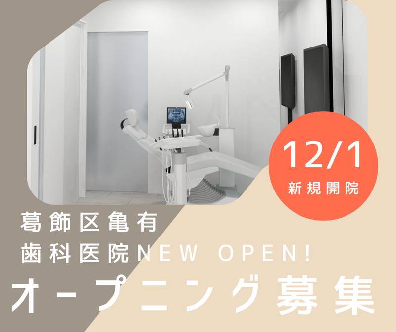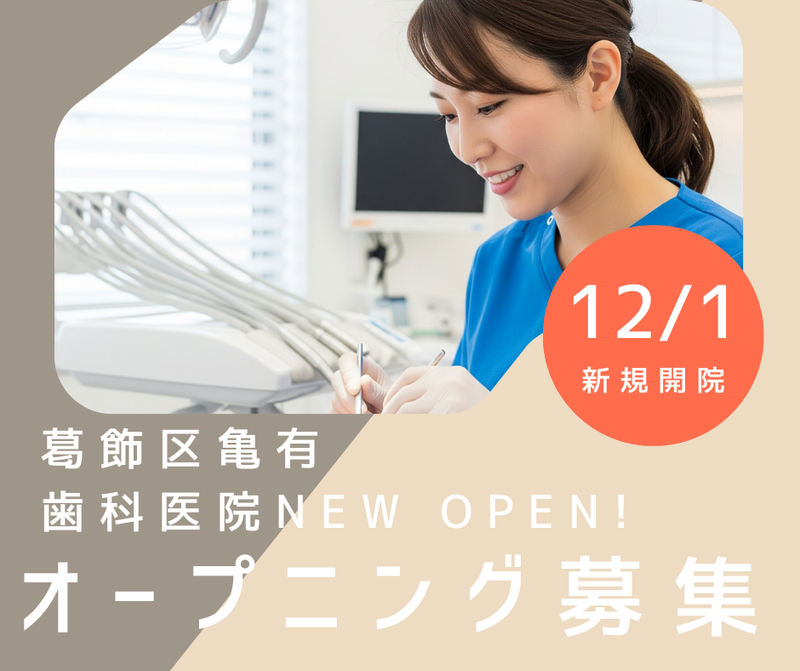 仕事内容 <2025年12月、亀有駅徒歩3分の好立地に新規開院する歯科医院> この度、新規開院に伴い、一緒にクリニックを盛り上げてくれるオープニングスタッフを募集します。 院内は白を基調とした清潔感のある空間で、患者さまはもちろん、スタッフにとっても気持ちよく働ける環境を整えています。 インプラント治療を中心に、小さなお子さんからご高齢の方まで、幅広い患者さまのお口の健康をサポートするやりがいのあるお仕事です。 「経験が浅いから不安…」という方もご安心ください! 資格取得や研修にかかる費用を全額補助するなど、あなたのスキルアップを全力でサポートします。 新しい環境で、歯科衛生士としてのキャリアを築きたいという意欲のある方を歓迎します。 【仕事内容】 ・歯科衛生士業務全般 ・インプラント治療のアシスタント ・予防処置 ・保健指導 【働く環境】 ・残業はほとんどありません。プライベートも大切にしながら働けます。 ・頑張りはしっかり評価! インセンティブ制度も導入予定です。 ・髪色・ネイル・ピアスは自由です。あなたらしいスタイルで働けます。 一緒に、地域の方々に愛されるクリニックを創りませんか? あなたからのご応募を心よりお待ちしています!
