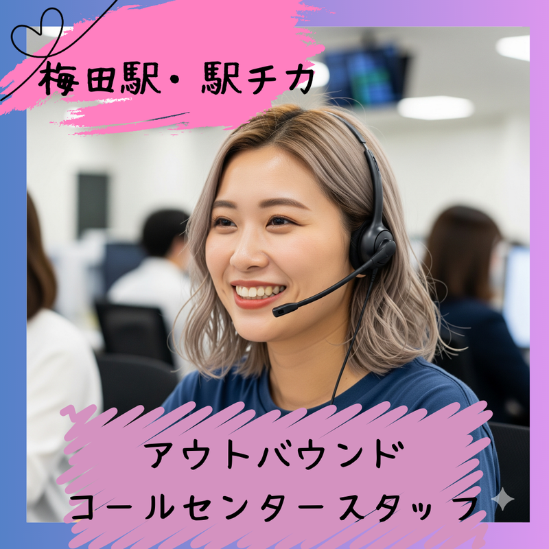 求めている人材 【応募資格】 ・アウトバウンドの経験がある方歓迎 ・基本的なPC操作ができる方(文字入力など) 【この仕事に向いている方】 ・アウトバウンドの経験を活かしたい方 ・話すことが好きな方 ・週5でしっかり働きたい方 ・梅田周辺で安定して働きたい方