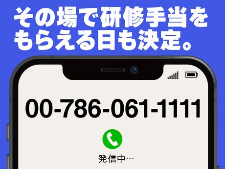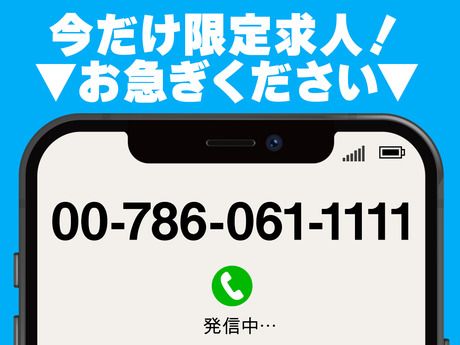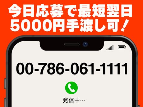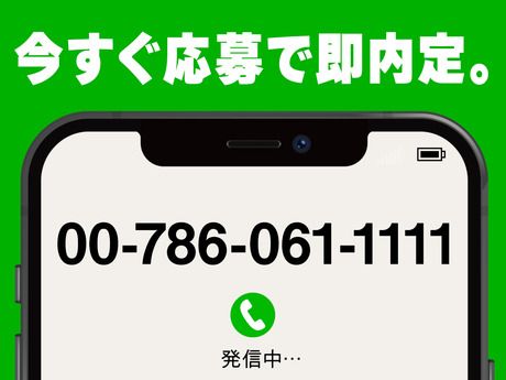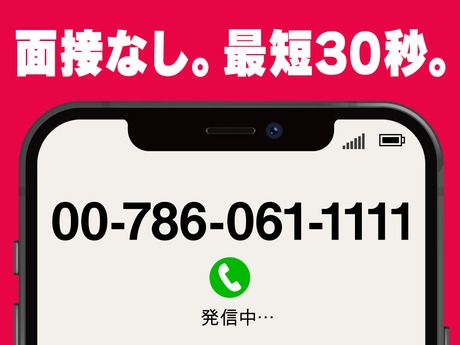 選考プロセス 電話応募で、その場で研修日時のご予約ができます。 あっという間にお仕事決定♪ ▼ご応募はこちらから▼ 【00-786-061-1111】 【問合せ先について】 問合せ先:0078-6061-1111 <TEL受付時間>平日9:00~17:00、それ以外の時間帯はWEBにて24時間受付中! 応募方法 ▼ご応募はこちらから▼ 【00-786-061-1111】 面接なし!来社なし!電話1本で完結! 簡単な確認のみで即内定! 自宅にいながら内定GET&履歴書不要!