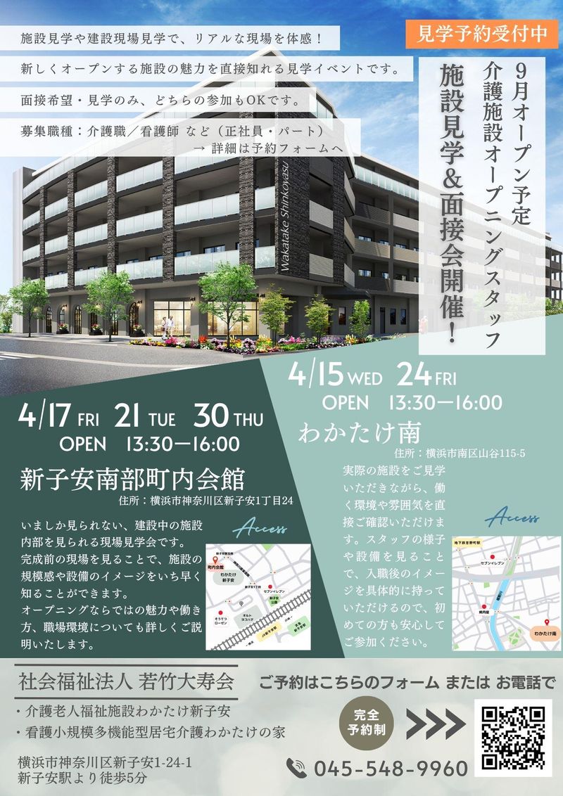 仕事内容 介護老人福祉施設 わかたけ新子安 オープニングスタッフ募集中! 2026年9月、介護老人福祉施設 わかたけ新子安がオープン予定です。 それに伴い、オープニングスタッフを募集いたします! オープンまで少し時間はありますが、 勤務開始前に様々なイベントも開催予定ですので、 ぜひご応募ください。 「オープニングスタッフとして 新しい施設で挑戦してみたい!」という方の 応募をお待ちしております! ★勤務開始について 勤務開始は、 2026年8月(開所の約1か月前)を予定しております。 ※8月以前のご入職をご希望の場合は、既存施設での勤務もご相談可能です。 ★研修内容 わかたけ新子安配属後、 1ヶ月間の研修と開設準備を行っていただきます。 研修はどなたでも安心して学べる内容です。 もちろん、研修期間中も給与が発生します! 【9月オープン予定のわかたけ新子安・わかたけの家(現在建設中)の見学会・面接会を開催します!】 「見学のみ」「面接のみ」「両方参加」すべてOK! ■新施設(9月OPEN予定)を見学したい方 日程: 4/21(火)・4/30(木) 時間: 13:30~16:00 今しか見ることのできない、建設中の内部を特別にご案内します! ■既存施設(わかたけ南)を見学したい方 日程:4/24(金) 時間: 13:30~16:00 実際の働く雰囲気をご確認いただけます! 興味を持たれた方は応募後ご案内いたしますので、気軽にお声がけください  ̄ ̄ ̄ ̄ ̄ ̄ ̄ ̄ ̄ ̄ ̄ ̄ ̄ ̄ ̄ ̄ 「介護の仕事は大変そう…」そう思っているあなたへ。 “ありがとう”が飛び交う温かい職場で、新たな物語を紡ぎませんか? もちろん、決して楽な仕事ではありません。 しかし、若竹大寿会には、大変さ以上の「やりがい」と「温もり」があります。 現場で働くスタッフの働きやすさを第一に考えたスタッフファーストを掲げています! 利用者様の笑顔、感謝の言葉、そしてスタッフ同士の助け合い。 「平均勤続年数8年4ヶ月」この定着率の高さが、私たちの働きやすさの何よりの証明です。 この募集を見てくださったあなたとの出会いを、心から楽しみにしています。 ⭐.。。. 若竹大寿会で働く【5つの魅力】 .。。.⭐  ̄ ̄ ̄ ̄ ̄ ̄ ̄ ̄ ̄ ̄ ̄ ̄ ̄ ̄ ̄ ̄ 【1】業界高水準の給与と賞与 賞与は最大7ヶ月分の実績!着実に収入アップが可能です。残業代も1分単位でしっかり支給します。 【2】プライベートを大切にできる環境 残業は月平均6.1時間とほぼゼロ。有給取得率は90%以上で、平均取得日数は14.4日と業界平均を大きく上回ります!希望休も考慮します。 【3】プロに育てる万全の研修制度 入社後は座学研修に加え、先輩がマンツーマンで指導する「プリセプター制度」をご用意。資格取得も無料の対策講座で手厚く支援します! 【4】明確なキャリアパスと実績 あなたの「なりたい姿」を全力で応援します。実際に未経験で入社し、施設の責任者(施設長)になった先輩もいます。 【5】助け合いの心で負担を軽減 スタッフの身体的負担を減らす**「持ち上げない介護」**を実践。困った時は職種に関わらず全員でサポートする、温かい風土が根付いています。 ⭐.。。. 具体的な仕事内容 .。。.⭐  ̄ ̄ ̄ ̄ ̄ ̄ ̄ ̄ ̄ ̄ ̄ ̄ ̄ ̄ ̄ ̄ 食事や入浴といった日常生活のサポートをはじめ、レクリエーションの企画などを通じて、ご入居者様が快適で充実した毎日を送れるよう支援するお仕事です。 ・起床、洗顔、食事、入浴などの直接介助 ・歩行訓練などの日常リハビリの支援 ・掃除、洗濯などの環境整備 ・日中の記録、事務作業(記録はスマホで簡単入力!) ・カンファレンスへの参加 ・レクリエーション、イベントの企画・実施 など 効率化できる部分は最新マシンに任せるスタイルです。 ⚪︎夜勤の負担軽減:見守りセンサーが「目」の代わりとなり、不要な巡回を削減 ⚪︎身体のケア:ノーリフティングケア(抱えない介護)を導入し、腰痛を予防 ⚪︎記録の効率化:スマホを活用し、その場でサッと事務作業を完了 ⚪︎ケアに集中:単純作業を減らし、入居者様(平均介護度3.7)との対話を重視 ⭐.。。. 1日のスケジュール例 .。。.⭐  ̄ ̄ ̄ ̄ ̄ ̄ ̄ ̄ ̄ ̄ ̄ ̄ ̄ ̄ ̄ ̄ 8:30 出勤。夜勤スタッフからの申し送り、朝食の片付け、お部屋の掃除 9:30 入浴介助、排泄介助、介護記録の入力など 11:30 昼食準備、食事介助(見守り) 13:30 << 休憩(60分) >> 14:30 おやつの準備、レクリエーションの実施、散歩の付き添いなど 17:00 夜勤者への引継ぎ、介護記録の最終チェック 17:30 退勤。「お疲れ様でした!」 ⭐.。。.資格取得支援制度 .。。.⭐  ̄ ̄ ̄ ̄ ̄ ̄ ̄ ̄ ̄ ̄ ̄ ̄ ̄ ̄ ̄ ̄ 対象資格: 【実務者研修、介護福祉士、介護支援専門員など】 支援内容: 専門講師による無料の資格取得支援講座があり、仕事をしながら、資格取得しやすい環境を整えています。 資格取得後は、合格お祝い金の支給、合格パーティーもあります。 ⭐.。。. 数字でみる“若竹大寿会” .。。.⭐  ̄ ̄ ̄ ̄ ̄ ̄ ̄ ̄ ̄ ̄ ̄ ̄ ̄ ̄ ̄ ̄ ・スタッフ数: 1,500名 (20代14%、30代17.9%、40代20.0%、50代23.3%、60代17.1%) ・割合:男性42.2%/女性5