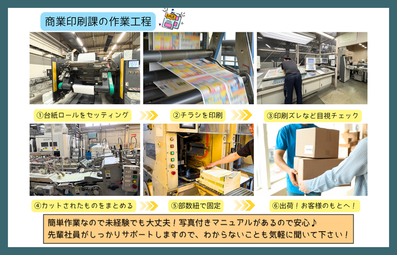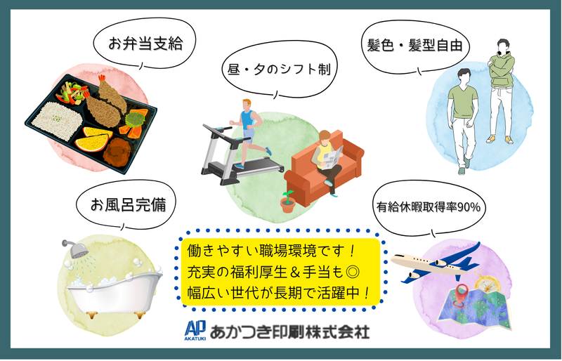 仕事内容 ✨【学歴・経験一切不問!高卒・短大卒も大歓迎】✨ <<機械オペレータースタッフ募集>> ✨勤務時間が実働6~7.5時間と印刷業界では珍しい働き方! ✨短時間だから疲れもたまりにくく、体力に自信がない方も安心です! ✨昼勤と夕方勤のシフト制!朝が苦手な方でも安心の17時スタートの夕方勤あり! ✨夕方勤務はお弁当支給あり!お弁当屋さんが休みの日は600円のお弁当代も支給! ✨自由に休みやすい環境!チームで助け合いながらシフトを調整できます◎ ✨お風呂完備でさっぱり帰宅!汗を流してから気持ちよく帰れますよ♪ 【仕事内容】 チラシなどを印刷する工場で、印刷機の操作やメンテナンス、印刷準備などを行うお仕事です。 機械を使って生産するスキルを身につけられます! チームで作業を行い、その日その日の印刷スケジュールに合わせて、協力しながら作業を進めていきます。 先輩に聞きながら働ける環境なので安心ですよ! ⏰1日のスケジュール例(昼勤の例です!) ▼9:00| 出社・着替え、ミーティング(印刷物の確認・作業内容の共有) ▼9:15〜| 印刷スタート(機械の点検・用紙やインクの準備なども含む) ▼12:00〜13:15| 休憩(60分+別で15時頃に15分の休憩をとっています) ▼13:15〜| 印刷作業の続き ▼16:30| 片付け・翌日の準備 ▼17:00| 退勤 お疲れ様でした! ※夕方勤も流れは同じです! 17時に出社し、23:30くらいに退勤するイメージ! ≪✅社員インタビュー≫ 【▼入社2年目/Yさん/20代】 ⏬入社のきっかけは何ですか? フリーターをしていた時に、知人の紹介であかつき印刷を知りました。ちょうど仕事を探していたタイミングで、未経験でもOKだったので、応募しました。 ⏬仕事のやりがいを教えて下さい! 元々機械が好きなので、シンプルに楽しいです!あと、印刷物の内容も日によって変わるため、新しいことを知る機会が多いのもやりがいです! ⏬あかつき印刷で働く魅力は何ですか? 働く時間がシンプルに短いです!笑 休みも取りやすくて、プライベートを大切にできるのが嬉しいです! 【▼入社8年目/Kさん/30代】 ⏬入社のきっかけは? 前は営業の仕事をしていて、転職活動中に求人を見かけて、興味を持ち応募しました! ⏬あかつき印刷で働く魅力は何ですか? 働く時間が短くて、趣味の時間がしっかり取れるのがありがたいですね。シフトは昼勤・夕方勤が1週間の交代で、夕方勤のときは昼に銀行とかも行けちゃいます!笑 ⏬仕事で大変なことは? 印刷物の量によって忙しさが変わるので印刷物が多い日には体力を使いますね。ですが、業務が少ない日もありますし、シフトが出るのも早いので、事前に心構えができるのも助かっています! ⏬求職者の方へ一言! みんなで助け合いながら働ける職場です。未経験の方こそ大歓迎です!ほとんどみんな未経験からのスタートなので!一緒に働けるのを楽しみにしています!