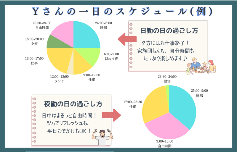 勤務時間詳細 実働時間:1日あたり6時間 〜 7時間30分 平均勤務日数:1ヶ月あたり20日 〜 23日 【1週間ごとの交代制シフト勤務】 ①昼勤:9:00〜17:00(休憩1時間15分) ②夕方勤:17:00〜23:30(休憩30分) ※夕方勤週には「中番勤務(13:30〜19:30)」が1回あり ※基本的に土日休み(土曜日は業務状況に応じて出勤の場合あり) ◇希望休の相談もしやすく、家族の急な体調不良などによるお休みにも柔軟に対応できる職場環境です。
