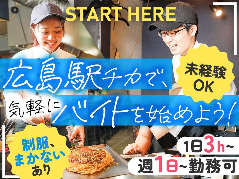 仕事内容 ○――――――――――――――――― 一生懸命やる!やりがいを見つける! そんなあなたの頑張りを見逃しません! ―――――――――――――――――〇 「見て、目が喜ぶ。 食べて、心が満たされる。」 そんな”こだわりの逸品”をご提供しています。 『てっぱん食堂』の夜営業は予約制。 お客様に ゆったりとした時間を過ごしていただいています。 【業務内容】 ■ホール…接客や料理の提供・片付け・レジ対応など ■キッチン…簡単な調理補助やドリンク作り・洗い物・閉店作業など >>具体的には ・ご注文伺い ・調理補助 ・ドリンク作り ・ドリンク、料理の提供 ・お客様が帰った後の片付け ・洗い物 ・閉店作業(ラスト作業) 終わり次第、まかないを食べます♪ 【入社後は】 まずは洗い物からスタート! 食洗機があるので負担は少なめ。 キレイに洗うのはもちろん、 効率良く進めることも重要ポイントです。 ▼洗い物を卒業したら… ホールorキッチン業務に分かれます。 <<ホール>> ホールスタッフはお店の”顔”! お客様に気持ちよく帰っていただけるように 目配り・気配り・心配りを大切にしています。 「ありがとう」「また来るね」と嬉しい声をかけてもらえるやりがいもあります! <<キッチン>> オープンキッチンなので、お客様に見られるお仕事です。 仕事中の所作などにも気を配るため、成長できます! 最初はサラダの盛り付けなど簡単な補助からスタートですが、 丁寧な仕事がお客様の笑顔につながります。 美味しそうに食べてくれる顔が見られるのも、やりがいのひとつです! ☆…☆…☆ \\人を笑顔にする喜び// せっかくアルバイトをするのなら 一生懸命取り組み、仕事のやりがいを見つけて 楽しく働いてもらいたいと考えています! 人に喜んでもらうことが好きな方にピッタリ◎ 【ココがポイント】 ★未経験OK!イチから丁寧に教えます ★17:00または18:00から勤務スタート ★1日3h~、週1日~勤務OK!扶養内での勤務もOK ★WワークOK!フリーターさんも歓迎 ★土日祝のみOK ★制服あり&履歴書不要で勤務までスムーズ ★バイク通勤OK 「広島駅」からも近く、通勤も便利◎ 社会人になってからも役立つマナー等も身に付きます。