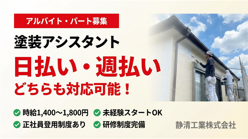 仕事内容 ⭐⭐⭐日払い・週払いOK!!⭐⭐⭐ 「すぐにお給料がほしい」 「明日買いたいものがある」 「急な出費で金欠。。」 そんな方のために 日払い・週払い制度完備! すぐに働けてすぐにお給料を もらえるので安心ですよ♪ ⭐⭐⭐⭐⭐⭐⭐⭐⭐⭐⭐⭐⭐ 建物の塗装スタッフがスムーズに作業できるよう、 アシスタントとして現場の準備や片付けなどの軽作業をお任せします♪ まずはお試しでアルバイト入社し、仕事や職場の雰囲気を知った上で 正社員として安定して働くこともできます! <具体的な作業例> ✅ 準備 塗料缶やローラーなど、作業に必要な道具を 使いやすい場所に配置します。 手順は決まっているので、未経験でも安心です。 ✅ 養生 窓や床が塗料で汚れないように、 テープやシートでしっかり保護します。 仕上がりを左右する大切な作業です。 ✅ 清掃・片付け 作業中に出たゴミの回収や、 使い終わった道具の片づけを行います。 次の作業がスムーズにつながるよう現場を整えます。 <入社後について> 最初は全員未経験スタートです。 ていねいな研修があるので、安心してください。 まずは道具の名前を覚えるところからスタート。 わからないことはその場で確認できる環境なので、 「置いていかれる」心配はありません。 <働き方の特徴> ・日払い/週払い可! 早めの収入確保ができます! ・正社員登用制度あり 希望者には積極的に正社員登用しています。 3ヶ月で正社員登用もOK! <キャリアアップ可能!> 「ずっとアシスタントのままなのかな?」という心配は不要です。 仕事を続けていく中で、「自分も塗ってみたい」という意欲が出てきたら、 本格的な塗装工へのステップアップを全力でサポートします!
