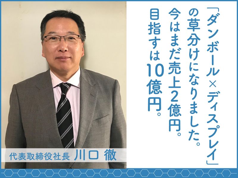 仕事内容 ★- めっちゃすごいのに、 まだ世の中に気づかれていません。 -★ ダンボール=茶色くて四角い箱、 なんて思っていませんか。 私たちはそんな常識を覆したくて、 展示会の企業ブース、販促什器から、 子供用のベッド、キャットタワーまで、 紙のダンボールで作ってしまう会社です。 どんな形・サイズでも対応可能。 強度抜群のダンボールで ありとあらゆるものを作ります。 このディスプレイ事業は、 商業施設やイベントと相性が良く、 問い合わせや紹介がメインです。 すでに多くのリピーターを獲得し、 全国に認知も広まりつつあります。 あなたにお任せしたいのは、 この事業の拡大とマネジメント。 「ダンボール×ディスプレイ」の価値、 その魅力をストーリーで語ることで、 共感を得て取引が成立するからです。 何のために必要か、 どんなものが欲しいのか お客様の想いをカタチにする プランナー寄りの営業です。 ✅「営業部長候補」ポジョンで、 年俸700万円以上でお迎えします。 ★- ワクワクしたいから、 ウチにしかできないこと始めました。 代表取締役・川口徹 -★ 1969年創業の当社は、ダンボールの 製造・販売・受託が中心でした。 しかし時代の流れの中で競争は激化し、 価格勝負に疲弊していきました。 2010年、事業承継してから、 最初に取り組んだのは、 生き残るための付加価値作り。 ウチにしかできない仕事とは何か。 それは“大きくて分厚く、 ワイヤー接合する特殊ダンボール“。 機械化が難しく、職人の手作業が必要。 他社が撤退していった領域です。 当社はあえて職人に残ってもらい、 次世代への技術継承の道を歩みました。 他社がやらない仕事を引き受ける。 これが再出発の第一歩でした。 そして「何かワクワクする、 将来伸びそうなことをやりたい」 と思った頃に出会ったのが、 スウェーデン生まれの「リボード」。 この環境配慮型の「紙建材」を使って、 ディスプレイ事業がスタートしました。 従来のブースは木工で作られていて、 展示会が終了すると解体され、 産業廃棄物になってしまいます。 一方、紙建材でブースを作ると、 組立も解体も時短かつ簡単。 繰り返し使うことができます。 強くて軽くてコストも大幅削減。 CO₂排出量も約1/3に削減でき、 リサイクルやリユースが実現。 採用すること自体、環境に配慮した 企業姿勢を社会にアピールできます。 もう、お分かりいただけましたか。 使い捨ての常識を覆す紙建材は、 今後数十倍の市場規模になる 可能性を秘めています。 ★- ただの箱では終わらせない。 この事業の売上2億円→10億円へ。 -★ 大手スーパーの登録カウンターや IT気鋭企業の展示会ブースなど、 人が集まる現場で、当社の紙建材の 採用が着実に広まっています。 売上はまだ2億円。 この事業はこんな規模で終わりません。 まずは10億円へ。 ✅営業部長のあなたへの期待 ・この事業をどう広げるか ・どの市場に仕掛けるか ・どう話題を作るか ・どう海外展開するか 対面営業だけでなく、 マーケティングやブランディング施策、 営業メンバーの意見も汲み取りながら、 事業を動かしてください。 社内には設計、画像処理、製造の 高い技術力を持つメンバーがいます。 あなたが描いた構想を形にしてくれる 頼もしい仲間が揃っています。 世の中は、こんな私たちの存在に そんなに気づいていません。 でもニーズの波は来ています。 この状況を思いっきり楽しめる人。 挑戦できる人。行動できる人。 そんな人と夢を描けたら最高です。 「ダンボール=ディスプレイ」の時代が、 もうすぐやって来ます。 “当事者”になるか、傍観者でいるか、 選ぶのはあなたです。