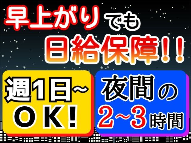 固定時間制 勤務時間 23:00~翌3:00(実働2~3時間) ※勤務店舗により異なります。 ※週1日~OK(日曜日は必ず出勤)