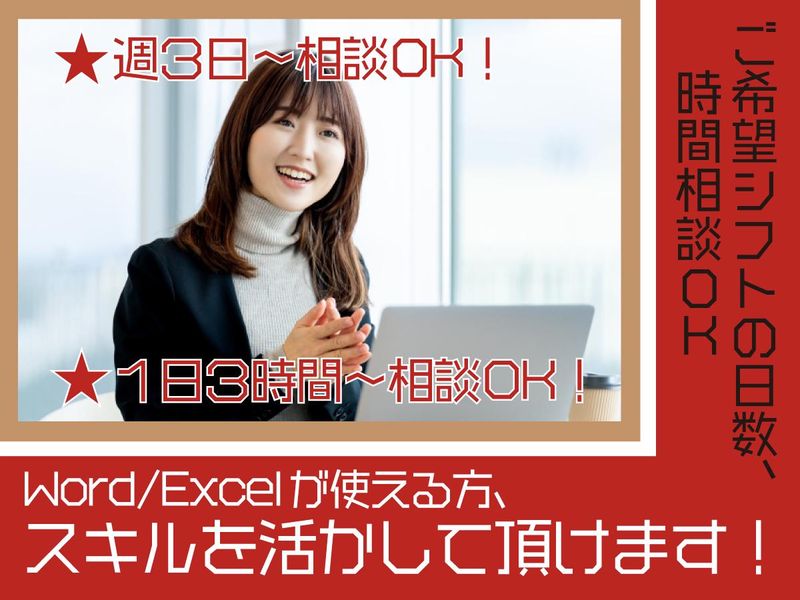 求めている人材 ★Word、Excelが使える方 ☆未経験の方大歓迎!事務経験のある方も歓迎いたします! ☆20~50代の女性スタッフ活躍中! ☆ブランクがある方も大丈夫です。