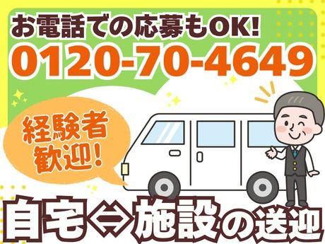 仕事内容 安全運転に自信がある方大歓迎! 年金だけじゃちょっと心配...。 そんな不安、このお仕事で解消しませんか。 ――――――――――――――――――― ■時給1500円! 月12万円の安定収入! ■70歳定年制(条件により更新可能) あなたの運転技術を長く活かせる環境です ■当社の安全管理体制で全面サポート! 無事故記録はあなたの誇りです。 ■中抜けOK! 通院付き添いなども両立可能 ――――――――――――――――――― 年金+αの収入で、 家計にゆとりが生まれる働き方◎ 「最近、ガソリン代も食費もじわじわ上がって、 今の収入だと少し不安...。」 「ドライバーって、本当にそんなに稼げるの?」 その不安、数字で証明します。 時給1500円×実働4時間×月20日。 計算すると、月12万円以上! 直行直帰OK!中抜けは自由時間♪ 一度帰宅してゆっくりお昼を食べたり、 通院したり、趣味を楽しんだり。 短時間勤務で体への負担も少なめです◎ このお仕事で活躍しているのは、 50代、60代のドライバーが中心。 落ち着いた雰囲気で、 長く安心して続けられます。 年金だけでは心配で、月10~12万円プラスしたい方、 お孫さんへの贈り物や、ご家族への思いやりを大切にしたい方 趣味や旅行のお金を無理なく稼ぎたい方にオススメです♪ 【仕事内容】 ● ミニバンでデイサービス利用者様の送迎 ● 安全確認と利用者様の見守り ● ご家族の方への安心・安全な送迎サービス 未経験でもOK!事前のコース確認でしっかりサポートします。 午前:8:15~10:15(2時間送迎) 午後:15:30~17:30(2時間送迎) ※直行直帰OK ※中抜けOK ◎ このお仕事のポイント ◎ ・優しい先輩ドライバーによる手厚いフォロー ・全国展開の実績がある安心企業 ・万が一のトラブル時は担当スタッフが迅速対応 「今日も安全運転、ありがとうございます」 利用者さんやご家族からそんな言葉をかけてもらえる。 お金だけじゃなく、 「ああ、役に立ててるな」って 実感できるお仕事です。 まだまだ社会とつながっていたい。 誰かの助けになりたい。 そんなあなたの気持ちに、しっかり応えます。 \ まずはお気軽にご相談を! / 「自分に向いているかな?」 「体力的に続けられるかな?」 そんな心配も、まずは話してみることから始めませんか。 あなたの不安や疑問に、丁寧にお答えします。 お電話でのお問い合わせも大歓迎! TEL:0120-70-4649 (受付時間:5:00~24:00/年中無休)