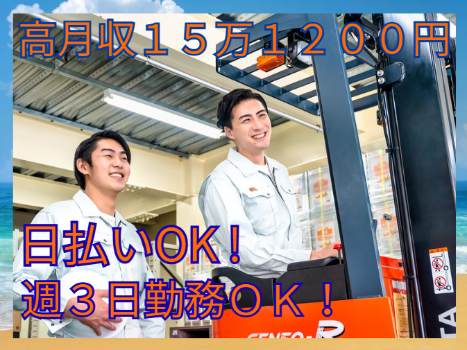 仕事内容 ✅週3日×高時給1500円✨日払いOK ✅月15.12万可×スーパーの取り扱い商品 ✨フォーク+軽作業で飽きなし(5:5)✨ ✅車・バイク通勤OK♪無料Pあり 食品・飲料・日用品など スーパーの商品を扱う倉庫でのお仕事! 【お任せする作業】 リーチフォークリフトでの商品の 入荷作業・格納・ピッキング ※作業割合はフォーク5割、軽作業5割ほど。 体を動かしながら働けるので、 同じ作業ばかりで飽きることはありません。 高時給1500円&月収15.12万円可能、 残業代含め全額日払いOKで、急な出費にも対応できます。 【アピールポイント】 社会保険完備(健康・厚生・雇用・労災)で安心勤務 車・バイク・自転車通勤OK&無料駐車場あり 日払い・週払い対応(規定あり)