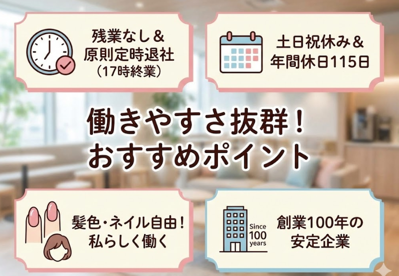 髪色・ネイル自由♪創業100年の安定企業で残業なしの事務✨