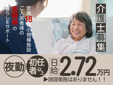 仕事内容 ■グループホームにおける夜勤専従介護業務全般 ※入居者様と一緒に食事の準備や、食事、掃除などを行い、日常生活のお手伝い ※入居者様ができることはご自身でされます ※どうしても手助けが必要な時だけサポートします ※調理業務はありません <主な業務> ■身体介助(食事/排泄介助) ■生活介助(居室清掃、洗濯) ■夜間時の安否確認 ■介護記録作成(パソコン・手書き) <お仕事の1日のスケジュール例> 16:30~【出勤】介護記録の確認、申し送り 17:00~【夕食】食事介助、見守り、服薬介助など 20:00~【就寝介助】トイレ誘導、更衣、臥床などの 21:00~【巡回業務】夜間の見回り、安否確認 00:00~【巡回業務】 環境整備、パット交換、体位交換 05:00~【巡回業務】早朝の見回り、コール対応 07:00~【起床介助】更衣、整容、フロアへの誘導など 07:30~【朝食】食事介助、服薬介助、口腔ケアなど ~09:30【退勤】介護記録作成、ごみ捨て、申し送り、退勤 <派遣先> 2ユニット定員18名グループホーム <新型コロナウイルス感染防止対策実施> マスク着用での勤務、アルコール消毒液完備などの感染対策をし、利用者様もスタッフも守れるよう体制を整えています。 <受動喫煙対策> あり(屋内禁煙) ここがポイント ■日給2万7200円(初任者研修以上) ■16:30~翌9:30(実働16時間)勤務 ■週2回勤務よりご相談ください ■調理業務はありません ■介護記録は、パソコンと手書き ■2ユニット定員18名グループホーム ■最寄駅より徒歩5分! ■バイク、車通勤可能