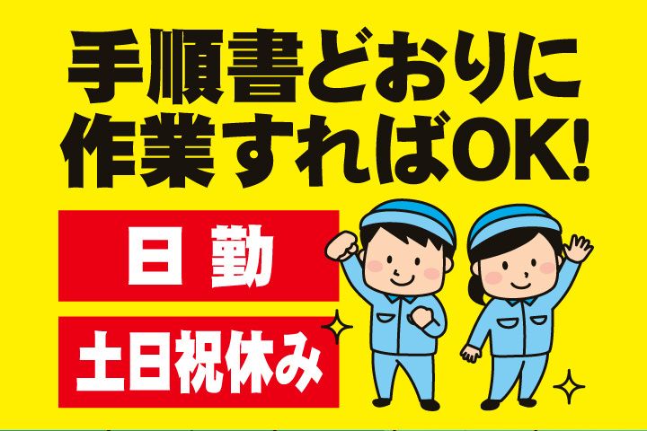 仕事内容 未経験OK!手順書通りに組み立てれば大丈夫 「人気の日勤&土日祝休み&残業少なめ」 需要ある半導体関連の工場だから長期安定 20代・30代の男女活躍中 \おすすめポイント/ ◎コツコツ作業に集中できる ◎丁寧に教えて貰えるので安心スタート ◎工場自体も新しくてキレイで快適 ◎長期連休のある月でも毎月固定の月給制 -◆-◇-◆-◇-◆-◇-◆-◇-◆-◇-◆- 【主なお仕事内容】 〇手順書を見ながら半導体製造装置の部品の組立 半導体関連の製造工場でのお仕事です。 トルクレンチやドライバー等の工具を使用します。 空調完備のクリーンルーム作業で快適です -◇-◆-◇-◆-◇-◆-◇-◆-◇-◆-◇- \こんな方におすすめ/ ◆未経験から製造にチャレンジしたい方 ◆組立・検査・軽作業・工場内作業・ ものづくりなどの経験をお持ちの方 ◆製造業の正社員・アルバイト・パート・ 派遣の経験を活かしたい方 ◆ハローワークでもお仕事をお探し中の方 求人内容の詳細については 面談時にご説明させていただきます。