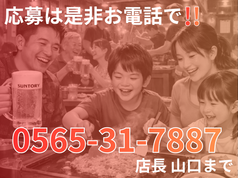 仕事内容 《 ✅この求人のポイント 》 【その1】 スタッフの6割が女性! 全席見渡せる店内は女性スタッフも安心✨ 仲良しの男女大学生9名が活躍中です! 【その2】 未経験・初バイト大歓迎(´▽`*) 一生懸命なスタッフばかりで 働きやすさ充実◎ 成長できる環境です! しっかり長く働きたい方にぴったり! 【その3】 車通勤OK&駐車場完備! 「新豊田駅」から徒歩5分と 歩きや自転車でも通いやすい♪ 雨の日でも快適です。 ―――――――――――――――― 《 ✅お願いするお仕事 》 鉄板焼き・もんじゃ焼き店にて 接客・キッチン業務をお願いします。 ■接客業務 お客様のご案内・注文取り お料理のご提供・テーブルの片付け など ■キッチン業務 お客様の前でのもんじゃ焼き作りや ドリンク作り・お皿洗い など ※もんじゃ焼き作りはきちんと 焼き方研修を行いますので 未経験・初心者の方もご安心を! ラストまで勤務して下さる方は 店内清掃など締め作業もお任せします。 お客様は常連さんが多く 楽しくおしゃべりができますよ♪ お客様に「頑張ってね~」と 声かけてもらえる あたたかい雰囲気の職場です◎ 《 あるスタッフの勤務例 》 ▼17:45 出勤 ▼18:00 接客等ホール業務 ▼23:00 退勤 まかない♪ ―――――――――――――――― 《 ✅おいしいまかないあり 》 日々、頑張ってくれるスタッフさんへ 店長が日替わりのまかないを提供します! 始めのうちはメニューを覚えるために お客様用のメニューを 食べてもらうこともあります! ※混雑時は出せない場合もあります ―――――――――――――――― 《 ✅仲良し&高めあえる環境 》 当店は仕事を通して 大きく成長できる環境です。 「仕事できて当たり前」 そんなモチベーションの高い スタッフが勢ぞろい! そのため当店のスタッフは全員 掛け持ちバイトをしていません。 店長とも仲が良く 「店長そろそろ休んでください~」 と声をかけてくれる 心優しいスタッフたちです( ;ω;`) 一人の店長という人間を知り、 人生経験になればいいなと 思っています。 ―――――――――――――――― 《 ✅履歴書不要&カジュアル面談 》 当店では面接ではなく、 まずは30分程度のカジュアル面談を実施✨ 《 ⏩電話でのご応募推奨! 》 木村店長【080-7976-1686】 スムーズに対応できるよう 電話でご応募いただけると 嬉しいです(*´ω`)ノ 気になったらまずはご応募を! 学生目線の店長と カジュアル面談をしよう♪ ―――――――――――――――― 《 時給はあなたが決めてください✨ 》 当店「木村屋」は あなたの頑張りをしっかり評価します! あなたの【やる気】【目指す姿】を 面接で教えて下さい♪