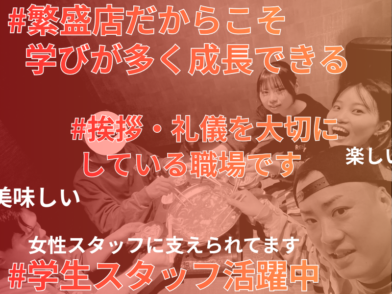 求めている人材 《 ✅経験者優遇! 》 ■居酒屋バイトでの経験を活かしたい ■さらにスキルアップしたい ■一緒にお店を盛り上げたい そんな志の高い方をお待ちしています✨ カフェや居酒屋・レストランなどでの 飲食・接客業務経験者は大歓迎♪ スタッフは計9名が在籍中。 6割が女性スタッフです! 高校生・大学生が活躍中で 同世代で仲良いながらも、 日々切磋琢磨しています◎