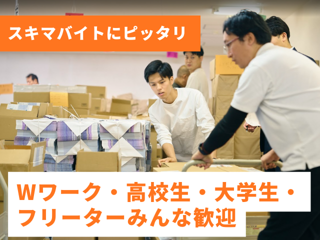 仕事内容 「金曜の夕方だけ、ちょっと働いてみませんか?」 \12月より豊中市へ移転のため、オープニングスタッフ大募集/ <POINT> ・学校や本業が終わった後の16:00〜20:00のみ! 週1日だから無理なく続けられます。 ・10代、20代、30代、40代、50代の男性活躍中 ・未経験OK、Wワーク・高校生・大学生・フリーターみんな歓迎! ・友達同士での応募もOK! <こんな方にオススメ> ・学校帰り、仕事帰りやお休み時にサクッと稼ぎたい ・金曜の夕方に時間が空いている ・副業やお小遣い稼ぎをしたい ・同じところでのスキマバイトを探している ・近隣や近所で働きたい <主なお仕事内容は> 設計事務所が手掛ける教育・食(農業)・地域の 新しい共創拠点で、大阪府下24拠点へ送る チラシのピッキング・仕分けをお願いします。 チラシの入った重い箱の運搬作業があるので、 体を動かすのが好きな方や筋肉をつけたい方にもおすすめです。 ~主に扱うチラシ~ ・類塾の生徒募集 ・大手飲食店の販促チラシ ・住宅情報など 2019年度以降売上高:大阪・関西No.1 安心安全の体制でお客様にご好評頂いております! <未経験OK!ブランクも問いません> 1人1人の負担が大きくならないよう、 運ぶ種類や量に応じて、1名〜数名のチームで作業します。 リーダーが全体の動きを見ながら 指示しますのでご安心ください。 まずは社員スタッフが仕事の流れから丁寧に教えます。 分からないことがあれば何でも聞いてくださいね。 オープニング募集なので、 同じ時期に始める仲間が沢山いますよ。 まずはお気軽にご応募ください。
