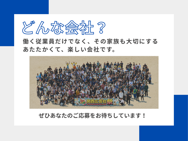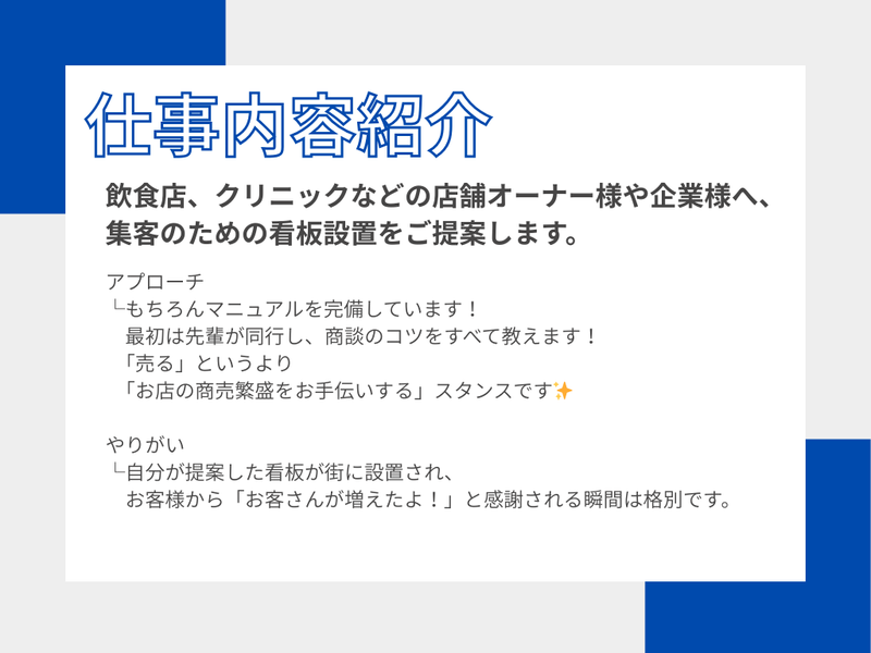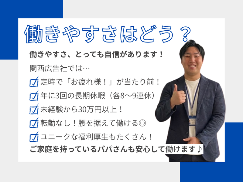 仕事内容 【家族を支える転職、ここなら叶います】 「子供が大きくなってきて、教育費が心配」 「今の会社の将来性に不安がある」 「家族との時間を増やしたいけど、収入は下げられない」 そんな悩みを抱える30代・40代のお父さんが、 未経験から多数活躍しているのが関西広告社です! 当社は創業30年以上、 全国35拠点を展開する屋外広告のプロフェッショナル。 今回の「尼崎営業所」は新しい拠点ですが、 ベンチャー企業のような不安定さはありません◎ 確立されたノウハウと、盤石な経営基盤が あなたの新しい挑戦をバックアップします。 ⭐新規事業所のオープニング募集! ⭐未経験から月給30万円以上 ⭐インセンティブでしっかり稼げる♪ ⭐転勤無し ⭐残業ほぼなし◎アフターシックスも楽しめる! ⭐経験年数により更に大幅アップもあり! ⭐頑張りはきちんと評価◎ ⭐日・祝+隔週土曜休み ⭐年3回の大型連休あり(8〜9連休!) ⭐賞与は年3回✨ 「営業=厳しい」は、もう昔の話。 自由なスタイルで、 家族も自分も大事にしながら活躍できます◎ ■ なぜ、未経験でも 「月給30万円」スタートなの? ┈┈┈┈┈┈┈┈┈┈┈┈┈┈┈┈•• 「未経験で30万円? 怪しいノルマがあるのでは?」 そう思われるかもしれません。 ですが、これには2つの理由があります! ①商品力が強いから 私たちが扱うのは、 街で見かける「屋外看板」です。 Web広告全盛の時代ですが、 「お店の場所を知らせる」 「地域の人に覚えてもらう」ために、 実店舗を持つお客様にとって看板は不可欠な存在です。 需要が無くならないため、 安定して受注が見込めます◎ ②人を育てる期間への「投資」! 看板営業は、お客様と信頼関係を築く仕事です。 焦って結果を求めるのではなく、 まずはじっくり仕事を覚え、 長く活躍してほしい。 家族を持つ方が安心して転職できるよう、 最初の生活基盤(固定給)を会社が保証します。 ■「18時退社」が当たり前の理由 ┈┈┈┈┈┈┈┈┈┈┈┈┈┈┈┈•• 当社では、ほとんどの社員が 18時〜18時半には退社しています。 ・直帰OK └会社に戻っての日報作成などは不要。 出先からモバイルで完了できます。 ・無駄な会議なし └ 営業活動に集中できる環境です。 ・家族時間を尊重する風土: └「今日は子供のお迎えが」 「学校行事があるから有給で」といった調整も、 お互い様で推奨しています✨ ※月給には固定残業代が含まれていますが、 これは「残業前提」ではなく 「営業職としての手当」という意味合いが強いです。 実際の残業は月平均20時間以下なので ご安心くださいね♪ ■ お仕事内容について ┈┈┈┈┈┈┈┈┈┈┈•• 飲食店、クリニック、美容室などの 店舗オーナー様や企業様へ、 集客のための看板設置をご提案します。 提案先 └新規オープンの店舗や、 看板が古くなっているお店など。 アプローチ └もちろんマニュアルを完備しています! 最初は先輩が同行し、 商談のコツをすべて教えます。 「売る」というより 「お店の商売繁盛をお手伝いする」スタンスです✨ やりがい └自分が提案した看板が街に設置され、 お客様から「お客さんが増えたよ!」 と感謝される瞬間は格別です。 ■当社について ┈┈┈┈┈┈┈┈┈┈┈┈┈┈┈┈•• 1992年の創業以来、 屋外広告に特化した事業を展開。 看板ひとつで街の雰囲気を変え、 お客様の事業を後押しできる―― そんな誇りある仕事です。 現在は全国に35拠点を構え、 2024年には【売上31億円】を突破! 業績は右肩上がり、成長性もバツグンです。 今回募集する尼崎営業所は、 そんな当社の“新しい挑戦”のスタート地点。 あなたもぜひ、立ち上げメンバーとして加わりませんか? 地域に貢献しながら、 自分の成長・収入アップも叶えられる。 それが、関西広告社の営業職です。 \SNS更新中✨/ 実際に働くスタッフの姿や会社の日常を公開しています! 「どんな雰囲気かな?」と思ったらぜひチェック♪ Instagram → @kansaikokokusha TikTok → @kansaikokoku_recruit