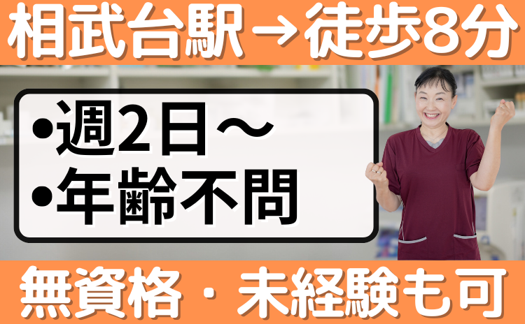 仕事内容 神奈川県座間市相武台にある デイサービス併設型有料老人ホーム 「福寿ざま相武台」で 日勤の介護スタッフを募集! 【オススメポイント】 ・週2日~勤務OK ・相武台前駅より徒歩8分の駅チカ ・定員20名のため、介護スタッフの負担少なめ ・年齢不問!50代、60代も歓迎 ・中高年、シニアパートも活躍中 【仕事内容】 日勤での介護業務全般をお願い致します。 具体的には ・日常生活の身体介護 (着替え、食事、排泄、入浴、移動の補助など) ・日々の食事の準備、居室の清掃 ・身の周りの整理整頓などの生活のサポート ・レクリエーションや外出の援助 【勤務時間・日数は柔軟に対応します】 週2日~勤務可能なのでWワークもOKです。 実際に働いてるスタッフは「稼ぎたい」 という理由で週4日で働いている方から 「介護職が好き」という理由で週2日で 体力を考慮しながら扶養内パートで 働いている方まで様々です。 勤務時間は ・7:30~16:30 ・8:30~17:30 ・9:00~18:00 のなかでご都合の良い時間帯で勤務可能! 勤務日数や時間はお気軽にご相談さい。 【駅チカで通勤もしやすい】 相武台前駅から徒歩8分のため、 運転免許のない方でも 電車通勤もしやすく、通いやすい施設です。 「車の運転が苦手だな」という方も 電車通勤で週2日から日勤介護職員の アルバイト、パートとして勤務できます。 【ブランクがある方もOK!】 子育てや親の介護などで介護職を離れた方も 資格や経験を活かして働けます! 老人ホームやデイサービスで介護職員として 働いていた方は感覚を思い出しながら 働くことが出来ます。 「ブランクがあるから不安」というかたも 安心してください。 社員や先輩のパート、アルバイトスタッフが 丁寧に仕事を教えるので、 徐々に感覚を戻しながら働いてもらえれば 大丈夫です。 【こんな経験がある方は即戦力で働けます】 ・グループホームの日勤パート介護職員 ・有料老人ホームのパート介護スタッフ ・正社員で介護職員としての勤務 ・介護福祉士、実務者研修、初任者研修等の 介護職に関する資格をお持ちの方 ・訪問ヘルパーのアルバイト、パート ・デイサービスのパート介護スタッフ 【当施設について】 相武台前駅から徒歩8分の駅チカにある 利用者様定員20名のデイサービス併設型 住宅型有料老人ホームです。 40代・50代・60代の家事、育児と両立して 働いている介護職員も多く在籍しています。 【応募を検討している皆様へ】 応募のご検討ありがとうございます。 募集内容をご覧になって ご興味をもっていただけましたら お気軽にお問合せください。 私たちも求職者様が安心して 一緒に働いていただけることを 楽しみにしています。