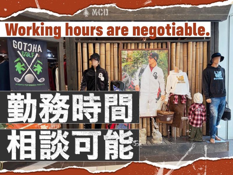 仕事内容 ╭━━━━━━━━━━━━━━━━╮ 大人気ブランドに携われるチャンス ╰━━━━━v━━━━━━━━━━╯ ★・―――――――――――――・★ / サーフ系ブランド / / 【 G-LAND EXTREME 】 / / 販売スタッフ大募集 / ★・―――――――――――――・★ オ/ ス/ ス/ メ/ ポ/ イ/ ン/ ト/  ̄  ̄  ̄  ̄  ̄  ̄  ̄  ̄ ・未経験大歓迎!サポート&フォロー体制◎ ・人気アイテムを社割でお得に購入可! ・服装&髪型自由!自分らしく働けます ・昇給有!契約社員への登用も可能 ・勤務地は神戸ハーバーランドUMIE! ・20~30代活躍中の 和気あいあいとした雰囲気 ┼────── お仕事内容 ──────┼ ・接客&販売 ・商品の陳列&整理/おたたみなど ・売上&在庫管理 ・清掃 など 店舗での業務全般をお願いします ……………………………………………… 未経験もOK◎実はアパレル未経験で 始めた先輩スタッフも多数! 洋服のたたみ方やレジ操作など、 イチから丁寧に教えます◎ ┼────────── G-LAND EXTREMEとは? ──────────┼ カリフォルニアサーフブランド GOTCHAのオフィシャルショップです。 「GOTCHA」「M.C.D.」など カリフォルニア系ブランドが多数! 小物や雑貨類もより豊富に取り揃えています。 ※取り扱いブランド※ ・GOTCHA ・GOTCHA GOLF ・MCD ・NESTA ……………………………………………… ブランドに詳しくなくても、大丈夫! 働いているうちに少しずつ自然と センスも磨かれるかも?! ┏………………………………………………┓ 商品はもちろん、お店、スタッフ、 サービスなどの全てに徹底的に 「かっこよさ」を追求し お客様に幸せな気持ちになっていただける 企業を目指しています。 そして、そんないい気分が広がれば 世界平和にもつながることを考えています。 あなたもそんな環境で働いてみませんか? ┗………………………………………………┛ ◇◇ お問い合わせも大歓迎! ◇◇ << TEL:0120-185-314 >> 「自分にできるかな」 「自分に合ってるかな」 「ファッションは好きだけど販売できるかな」 など不安なことがあれば、 なんでも相談してください! 質問も大歓迎! まずはお気軽にお電話ください。 お待ちしています!