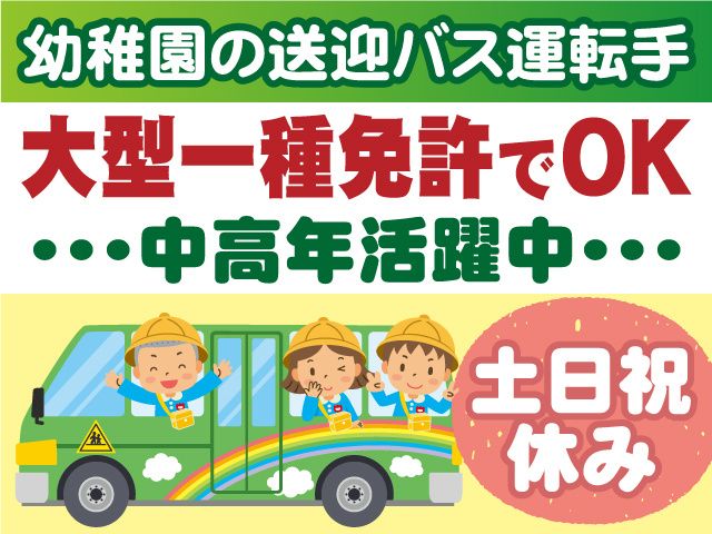仕事内容 幼稚園送迎バスドライバー ・月給制で安定収入 ・中抜けOK! ・土日祝休み ・勤務開始日応相談 <お仕事内容> 松戸市秋山駅近くの幼稚園にて 朝と午後の送迎バス運転手業務 ・駅周辺、幼稚園~園児の自宅近くの固定ルート ・幼稚園へ直行直帰(マイカー通勤OK) ・使用車両:マイクロバス(AT車) 中抜けで帰宅もOK 朝の迎えと午後の送りの合間は帰宅もOK 自由に中抜け時間を使えます。 幼稚園の先生が同乗 運転時は幼稚園の先生が同乗します。 園児の対応はありませんので運転に集中できます。 幼稚園バス運転手が未経験でもOK 大型1種の免許があればOK! 固定ルートの運転なので、道に詳しくなくても心配ありません。 トラックドライバー(中型・大型ドライバー)から転職した方も在籍中。 企業の従業員送迎運転手やスクールバスドライバー経験がある方は活かせます! 50代・60代の方も活躍中 定年退職後の中高年・シニア世代の方も多数活躍中! Wワークにもぴったりです! 月給制で安定収入 土日祝休みで長期休暇もあり。 月給制だから、祝日が多い月も安定した収入が得られます! 勤務開始日、考慮いたします。 疑問・質問・不安な事などあれば お気軽にお問い合わせください。