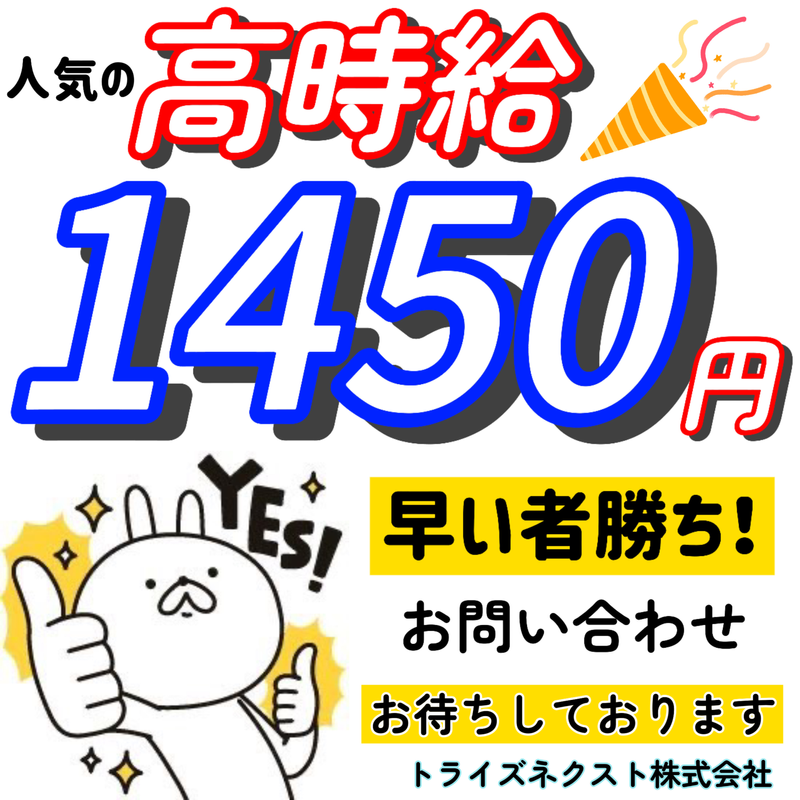 時給1,450円~1,813円 ■給与 時給 1,450円~1,813円 交通費別途支給※1㎞辺り16円×往復代 ※定期代1か月分支給