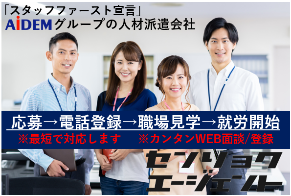 【保険制度】 雇用保険、労災保険、健康保険、厚生年金 待遇 <<派遣先待遇>> ◇制服貸与 ◇食堂有り ◇ロッカー完備 ◇サポート体制も充実 ◇研修期間あり(同時給) ◇空調完備 <<戦力エージェントの福利厚生>> ◆各種社会保険 ※入社日から即日加入も可能◎ (雇用保険・健康保険・厚生年金・労災保険) ◆交通費支給 ◆各種手当(家族手当・住宅手当・配偶者手当) ◆前払い制度 ◆有給休暇 ◆特別休暇 ◆スキルアップ制度 ◆定期健康診断 ※勤務場所の喫煙環境:屋内全面禁煙(屋外喫煙可)
