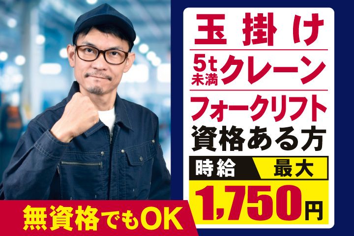 資格・経験 18歳以上(深夜勤務を伴うため) 未経験・無資格OK 以下の資格をお持ちの方は尚可 ・玉掛け技能講習修了証 ・5トン未満クレーン運転特別教育修了証 ・フォークリフト運転技能講習修了証