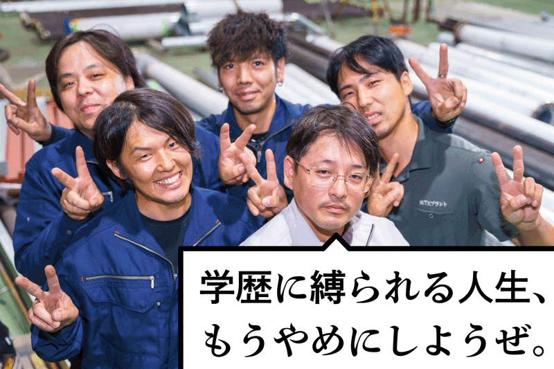 求めている人材 ✅学歴不問(ホントに学歴不問) ◆中卒、高卒、専門学校卒、短大卒、四大卒、大学院卒まったく関係なし! ✅マジで未経験者歓迎 ◆経験者はもちろん歓迎ですが、それ以上に無資格歓迎! ◆ド素人、大歓迎!今の社員も全員ドドドドドド素人でした ◆話を聞いてから応募する・しないを決めてもOK ◆働いたことがない社会人未経験者、フリーター大歓迎 ◆家庭環境なども一切不問 ✅やさしく教えます ◆「見て覚えろ」はなし ◆みんなで教え合い、助け合う風土 ◆チームワークを何よりも大切に ✅こんな方もOK ◆キャリアアップ・スキルアップに熱意がある方 ◆ライン工・製品組立・組付・機械加工・切断加工・切削加工・穴あけ加工・エッチング・研磨・プレス加工・成形加工・熱処理・部品検査・製品品質検査といった「職種&業界は全く未経験だけど、製造業や工場でのものづくり経験があるから、一から創っていく建設工事・配管工事にも興味がある」という方 ◆造園施工管理技士、電気施工管理技士といった別ジャンルの施工管理経験や、建設工事・土木作業員、大工、内装工事、リフォーム・リノベーションなどの同業経験者かつ異職種経験者が施工現場での経験・知識を活かして活躍中! ◆もちろん案件担当、現場施工、工事進捗管理、施工計画策定写真管理、業者選定、施工図作成、機器選定、測量業務といった施工管理職経験者も歓迎! ◆産業系プラント・環境系プラント・機械プラント・石油化学系プラントのプロジェクトなどに携わったことのある経験者歓迎!ブランク歓迎! ※正社員、契約社員、単発の派遣社員や期間工、夜勤・深夜や短期のアルバイト・パートなど、これまでの雇用形態は問いません。 ー 【社員の入社理由を紹介】 ✅溶接を覚えたい TikTokを見て「おもしろそう!」と思って応募しました。 ✅給料がいい 「自分みたいなペーペーでも月給30万円ホントにもらえるの?」と思っていたら、ホントにもらえました。 ✅雰囲気がいい 神谷社長は社長っぽくなくて、お兄ちゃんみたい。先輩方も同じで、すごく親しみやすいです。 ✅将来性がある 配管工事はずっとなくなりません。TKプラントはしっかりとした強みがあります。将来も安心です。 ✅休みが多い 働きやすさもTKプラントの魅力!年間休日は120日。1年の1/3がお休みです。