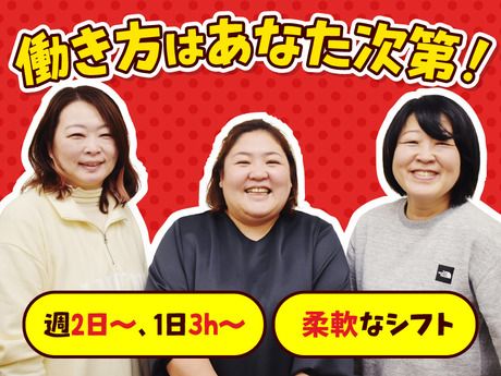 職場環境 【従業員構成】 <スタッフの声> ・シフトが柔軟で子どもの行事に 参加しやすい環境です(30代主婦) == ・ミドル世代が多くはたらいていて無理なく 馴染むことができました(50代Wワーカー) == ・仕事は一度覚えれば楽しくできますよ◎ (20代フリーター) == など、はたらきやすさだけでなく、 仲間もミリョクに思ってくれている スタッフがたくさんいます♪ 【職場の雰囲気】 にぎやかな職場 立ち仕事 アットホーム お客様との対話は多い 自分の都合に合わせやすい 知識、経験不要