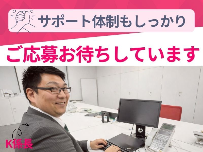 仕事内容: ✧事務未経験OK✧ \ 月給28万円スタート / まずは簡単な業務からスタート。 ただし、慣れてきたら一段深い役割へ。 任せるからこその待遇です ◆土日祝休み&年間休日120日以上 ◆残業少なめ(30分~1時間ほど) ◆大手企業と取引多数!成長し続ける安定企業 ◆お菓子やコーヒー・お茶などが格安で楽しめる♪ <応募から最短3日で内定> 平日・土日どちらも面接OK◎ 応募資格は、 「ちょっと気になったから応募してみた」でOKです ………………………………… 【ご応募について】 WEB応募ならたった1分で完了! 電話応募は 080-5547-4942(採用担当)まで ………………………………… 【仕事内容】 電話応対やサポートセンターでの受付業務を中心に、 “現場が止まらないよう支える”お仕事です。 あなたのペースに合わせて、できる業務からお任せします。 <入社後の成長イメージ> ▼1年目/まずは基本業務からスタート ・データ入力 ・書類チェック ・電話、メール対応 ▼2年目以降/少しずつ業務の幅を広げます ・進捗の確認 ・他部署とのやり取り ・後輩のサポート などもお任せします ▼その先/キャリアアップも可能 チームをまとめるポジションや、業務改善に関わる役割で活躍する道もあります。
