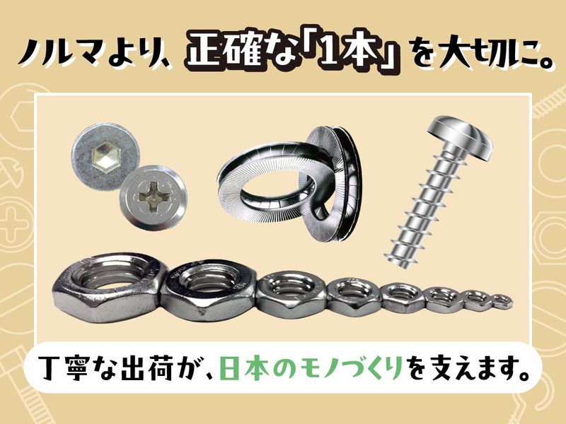 仕事内容 「数字」を追いかけるより、目の前の仕事を一つずつ。 1本のネジで「誰かの役に立つ」手応えを✨ 「1本のネジが、日本を動かしている」 そう聞いても、最初はピンとこないかもしれません。でも、私たちが扱うネジやボルトは「産業の塩」と呼ばれ、これなしではビルも車も、家電すらも完成しません。 今回募集するのは、単に倉庫でモノを運ぶだけの「作業員」ではなく、現場を支える大切な仲間! 誠実にコツコツと取り組むあなたの姿勢が、アヅマネジの信頼を支える大きな力になります。 数年後には、チームのみんなから頼られる中心メンバーになってほしいと考えていますが、まずは焦らず、あなたのペースで始めていきましょう。 【この仕事のポイント】 ━━━━━v━━━━━ ✅17:30定時で、残業はほとんどありません。家族や自分の時間を大切にできます。 ✅年間休日125日&土日祝休み!心にゆとりを持って働ける環境です。 ✅年内のシステム刷新により、バーコード管理へ移行中。未経験でもスムーズに慣れていただけます。 【具体的なお仕事内容】 ━━━━━v━━━━━ 自社センターにて、ネジ・ボルトの在庫管理や出荷作業をお任せします。アヅマネジの特徴は、大手には真似できない「1本からの注文」にも即座に応える小回り。あなたの正確な仕事が、お客様の緊急事態を救うこともあります! ◆ピッキング・出荷作業 注文リスト(伝票)を確認し、倉庫の棚から該当するネジを探します。その後、検品・梱包して発送準備を整えます。 扱うネジは数万種類ありますが、置き場所は決まっているので、一つひとつ照らし合わせて進めます。 ◆在庫の管理・発注 棚の在庫が少なくなってきたら、仕入れ先へ発注を行います。 「いつものネジ」が切れないよう、日々の動きをチェックする大切なお仕事です。 ◆お客様対応(デスクワーク含む) 慣れてきたら、特定のお客様(一人平均3社ほど)を担当します。電話やメールで届く「このネジ、在庫ある?」「いつ届く?」といったお問い合わせに回答します。 顔なじみのお客様が増えるたび、頼られる喜びを実感できます。 <教育体制> 「ネジの形なんて全部同じに見える…」最初はそれで当たり前。ベテランスタッフが隣について、あなたのペースに合わせて丁寧に教えます。 まずは言われたことを一つずつ正確にこなすことから。ゆくゆくは、パートさんに指示を出したり、もっと効率的なやり方を提案したり。一歩ずつ、頼られる存在へとステップアップしていきましょう。 <ここがやりがい> 「アヅマネジさんなら1本からでも届けてくれる」という信頼が私たちの自慢です。あなたが心を込めて包んだ1本のネジが、大きな製品の一部になる。 その誠実な仕事が、お客様からの「ありがとう」に繋がります。 また、少数精鋭だからこそ「もっとこうしたら?」というあなたのちょっとした気づきが、会社の仕組みをより良く変えていく面白さもあります。 <ここは大変かも> ネジの種類はとても多く、ミリ単位の違いを見極める几帳面さが必要です。 また、春先の繁忙期(12月~3月)は注文が重なり、少しテキパキと動かなければならない場面も。 チームで協力して乗り越える文化があるので、一人で抱え込むことはありませんが、コツコツした作業の合間に「チームでの一体感」も大切にしています。 【アヅマネジについて】 ━━━━━v━━━━━ 創業70年、墨田区で歩んできた、小規模で温かな会社です。今はちょうど、最新の管理システムを取り入れている「リニューアル期」。 これまでの良いところは残しつつ、より働きやすい会社を一緒に作ってくれる仲間を待っています。