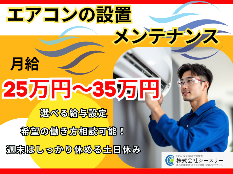 仕事の内容 ◆◆このお仕事のポイント◆◆ ・未経験OK!空調機器の清掃、洗浄、保守管理スタッフ募集! ・スキルや習熟度に応じて昇給が見込める給与体系です ・日々の頑張りや技術習得は評価制度を通じて給与に反映されます ・初任給は未経験でも高水準、25万~昇給・賞与も充実! ・学歴や職務経験に関係なく熱意のある方が活躍中! ・ゼロから専門技術を習得し、安心して働ける環境が整っています! ー ◆募集背景◆ 嬉しいことに多くのお客様からご支持をいただき業績好調の今、さらなる飛躍に向け現場スタッフの増員募集を開始! 新たな挑戦とキャリアアップを求める方は、ぜひ私たちの仲間として次のステージへ一緒に進みませんか? ー------------ ◆お仕事内容◆ 空調設備の清掃・メンテナンス・設置・取り付け ◆具体的に?◆ <現場>・・・関東近郊のビルや商業施設、店舗など。 <人数>・・・1現場につき1~3名で、1日1~2件の現場を担当します。 <内容> ▼屋内にてインパクトや工具を使用しての分解 ▼高圧洗浄機を使用しエアコンをキレイに洗浄 ※濡れることはないので通常の作業着で大丈夫! ー ◆入社後は?◆ 初めはシンプルなサポート業務からお任せします。 現場には経験豊かなスタッフがそろっており、フォローする体制も万全です! また、特定の資格は必要ありませんので、異業種からの転職者も問題なく活躍できます。 ー ◆シースリーの魅力◆ 設立以来14年の歴史を持つ当社は、サービスと技術に対する信頼のもと着実に成長を遂げています。 社員が長く働き続けられる環境を目指し、スキルや経験、役割に応じた評価制度・給与体系を整えています。 「収入を安定させたい」「仕事にメリハリをつけたい」「技術を正当に評価してほしい」 そんな想いを持つ方が、腰を据えて働ける環境です。 ー-------------- ◆未経験でも大丈夫?◆ 問題ありません。異業種からのキャリアチェンジも応援します! 空調設備の清掃・メンテナンスの経験は一切問いません。 入社時点で専門知識は必要なく、ゼロから学べる環境です。 ー-------------- ◆どんな人が働いているの?◆ 関東支店では、約5名のスタッフが様々な現場で活躍してます。 移動中や休憩時には、30代を中心としたスタッフが集まり、ゲームの話題で盛り上がったりとしっかりコミュニケーションが取れているのも当社の自慢の1つです。 社員同士が楽しみながら働ける環境や社長の温かい人柄もあって、新入社員がすぐに打ち解けられる雰囲気です。 ー <このお仕事の特徴まとめました> ●空調・エアコン・設備機器の取り付けメンテナンス ●洗浄・清掃・掃除やクリーニングスタッフ ●正社員で安定した環境で働ける ●土日休み ●GW、お盆休み、年末年始などカレンダー通りの長期連休あり ●未経験OK ●高月収25万円~ ●昇給&賞与あり ●頑張りやスキル習得がしっかり収入に反映