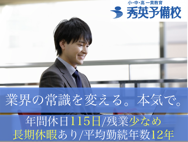 仕事内容 【未経験から、教えるプロへ】 君の言葉で、生徒の未来は輝きだす。 「わかった!」が、最高のやりがいに。 ▼仕事は、生徒の未来を創ること。 あなたの言葉で「わかった!」を引き出し 生徒の人生に、深く、直接関わる仕事。 「先生のおかげ」その一言が原動力に。 担当教科は数学です。 あなたの得意を、生徒の未来へ繋げます。 ┏━━━━━━━┓ ◆ お仕事内容 ◆ ┗━━━━━━━┛ 高校生・卒業生の学習・進学指導、 生徒募集活動など全般をお任せします。 教科は数学です。 ■具体的には・・・ ・教材研究 ・授業の予習 ・集団授業 ・質問対応 ・生徒、保護者との面談 ・電話応対 ・生徒募集活動 ◆プロの授業は、準備が9割。 ━━━━━━━━━━━━━━━━━━━ →教材研究/授業準備 どう伝えれば一番響くか… 工夫を凝らすクリエイティブな時間。 ◆いざ、主役として教壇へ。 ━━━━━━━━━━━━━━━━━━━ →集団授業/質問対応 生徒の表情を見ながら、言葉を紡ぐ。 あなたの個性が光る舞台です。 ◆一人ひとりの伴走者として。 ━━━━━━━━━━━━━━━━━━━ →生徒・保護者面談 学習面だけでなく、将来の夢も応援。 深い信頼関係を築いていきます。 ┏━━━━━━━┓ ◆ 1日の流れ ◆ ┗━━━━━━━┛ 13:00 出社・ミーティング 13:30 授業準備 15:00 休憩 16:30 生徒出迎え・声掛け・デスクワーク 18:20 授業 21:40 授業終了・生徒への声掛け・見送り 22:00 終業 【未経験から「教えるプロ」へ】 体系的な研修で、本物の指導力を。 ▼トップ講師の技術を完全マスター ━━━━━━━━━━━━━━━━━━━ 話し方、板書、生徒の惹きつけ方まで プロの技術を動画でいつでも学べます。 あなたの「好き」を「スキル」に。 ▼専属メンターがデビューまで伴走 ━━━━━━━━━━━━━━━━━━━ 入社後1年間、先輩がマンツーマンで あなたの成長を徹底的にサポート。 授業の練習相手にもなってくれますよ。 ▼未経験でも安心の研修・サポート体制 ━━━━━━━━━━━━━━━━━━━ 「教えることに自信がない」 という方でも心配いりません。 チョークの持ち方から板書の仕方、 生徒との接し方など、段階的に学べる 研修制度を用意しております。 【先生が主役。授業に100%集中】 ルーティンワークは、もういらない。 教材作成や事務作業は専門部署が担当。 あなたは「教えること」のプロとして、 生徒と向き合う時間に全力を注げます。 映像授業の活用や、 保護者との連絡アプリの導入など… 業務負担を減らす取り組みを進めており 生徒一人ひとりと向き合う時間を大切にできます。 会社の歯車じゃない。 あなたが、生徒を導く主役です。 【「好き」を仕事に。ずっと、ここで。】 プロとして輝き続けるための環境。 ◆年間休日115日/長期休暇あり しっかり休んで、授業の質も高める。 自己研鑽の時間も確保できます。 ◆月平均残業5時間/有給取得実績◎ 業界随一の残業時間の少なさ。 プライベートも大切にできるから、 仕事への情熱も燃え続けます。 ◆勤続年数12年 - 平均年齢37.1歳 「秀英予備校は、人がいい」 「働きやすさを追求する社風」 長く働ける環境がここにはあります。 【業界の常識を、本気で変えます】 ”教育業界だから”を、言い訳にしない。 勤怠システムで勤務時間を1分単位で管理。 サービス残業なんて、ありえません。 健全な環境が、最高の授業を創る。 私たちは本気でそう考えています。 【ライフステージが変わっても、教壇へ】 産休・育休取得率100%。 時短勤務も可能。 男性の育休取得実績も多数あります。 働き方の相談や勤務時間の調整など 柔軟に対応します。 実際に結婚・育児をしながら 活躍している社員が多数在籍しています。 人生のどんなステージにいても、 「先生」であり続けられる場所です。 あなたのキャリアを、会社が守ります。